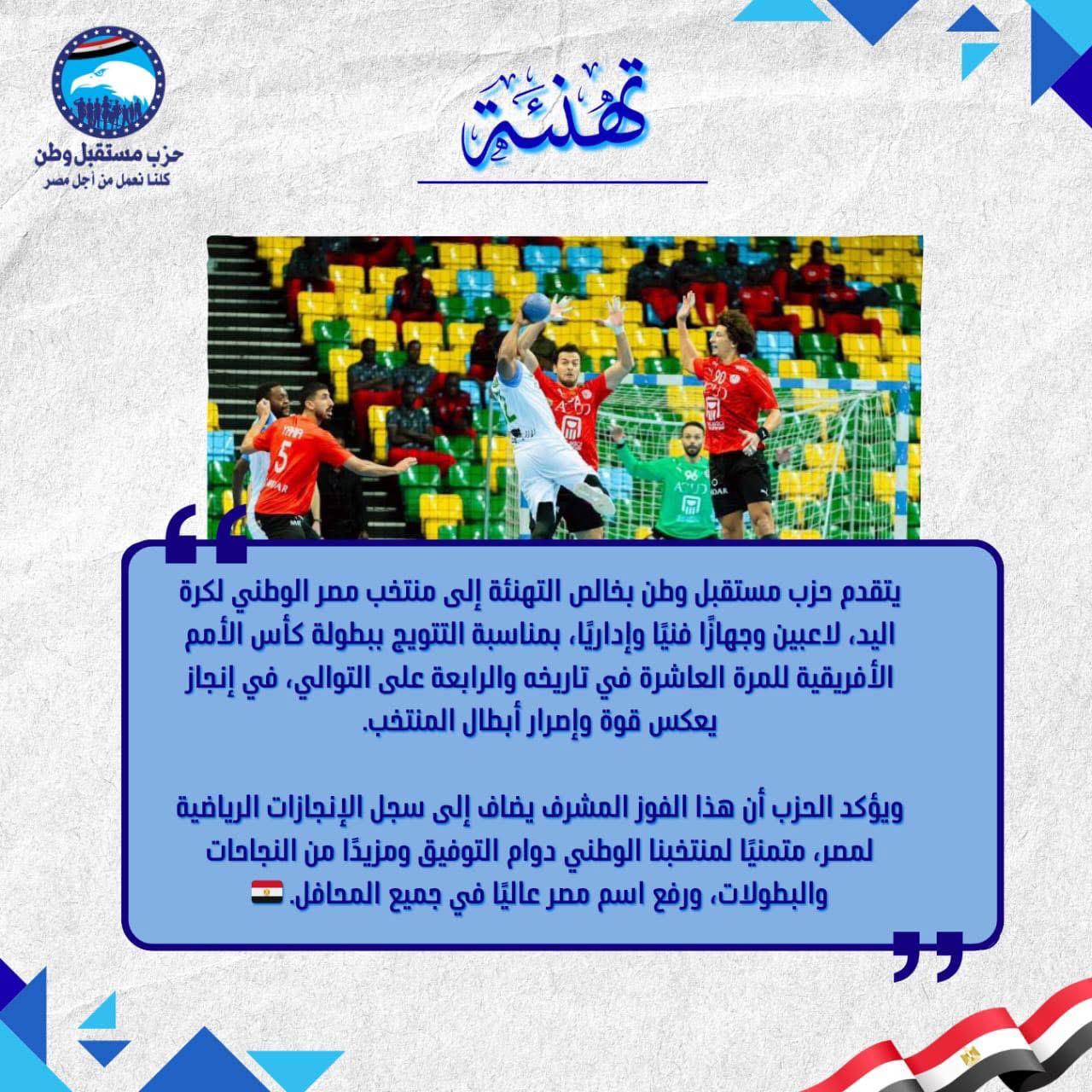 حزب مستقبل وطن يهنئ منتخب مصر لكرة اليد بالتتويج بكأس الأمم الإفريقية