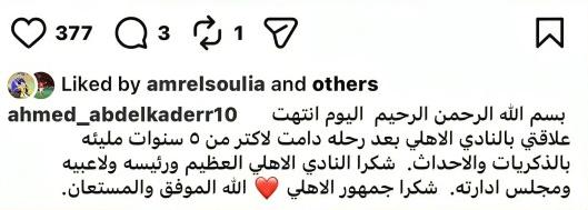 وعبر حسابه الرسمي على موقع «إنستجرام»، وجّه عبد القادر رسالة شكر وتقدير إلى النادي الأهلي وجماهيره، مشيدًا بالدعم الذي تلقاه طوال فترة وجوده داخل الفريق، ومؤكدًا أن رحلته مع الأهلي حملت الكثير من الذكريات والتجارب التي ستظل عالقة في ذهنه.