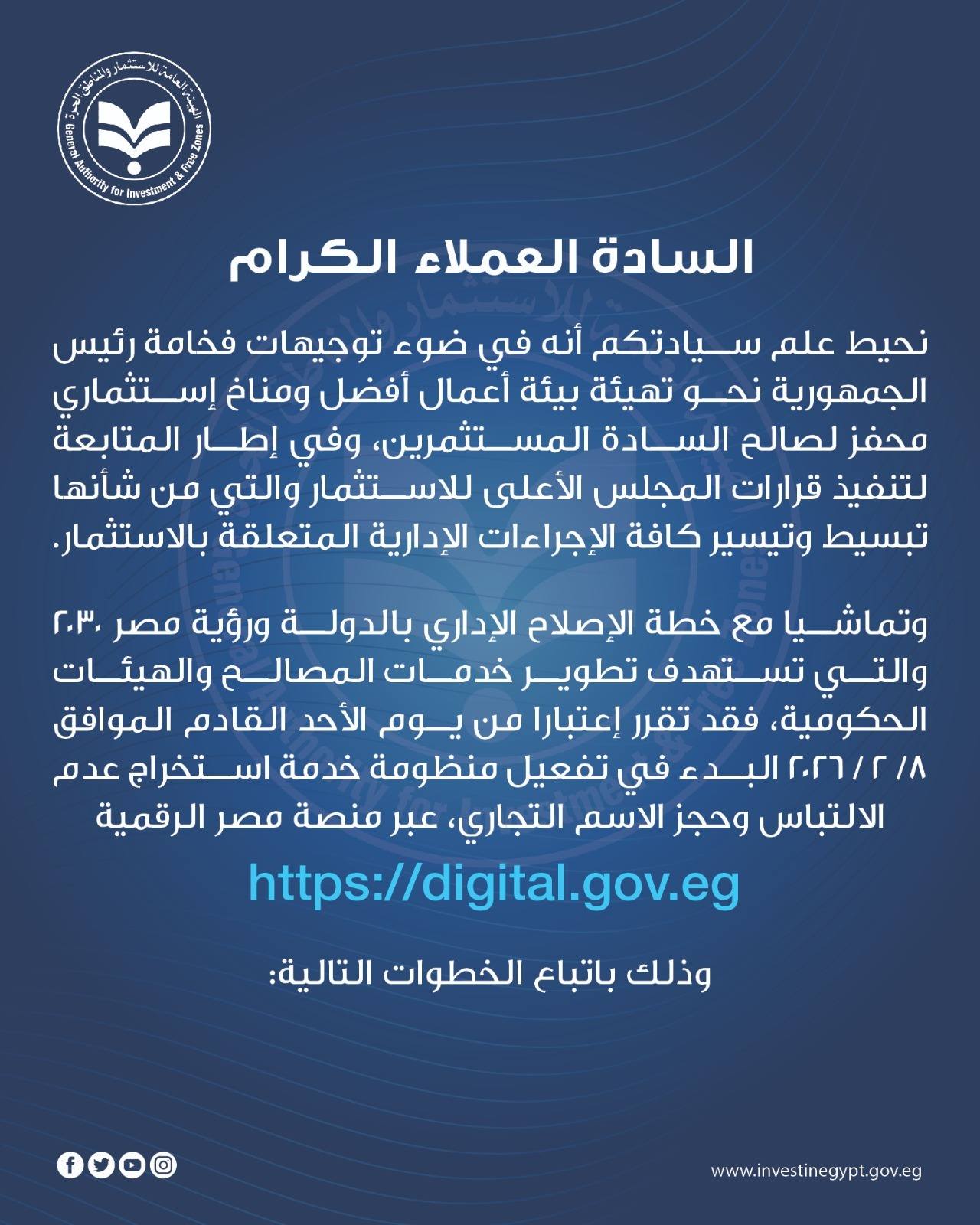 أعلنت الهيئة العامة للاستثمار والمناطق الحرة، بالتعاون مع جهاز تنمية التجارة الداخلية، عن تفعيل منظومة استخراج شهادة عدم الالتباس وحجز الاسم التجاري إلكترونيًا عبر بوابة مصر الرقمية (https://digital.gov.eg)، اعتبارًا من 8 فبراير 2026، وذلك ضمن مستهدفات رؤية مصر 2030 للإصلاح الإداري وتطوير منظومة الخدمات الحكومية.