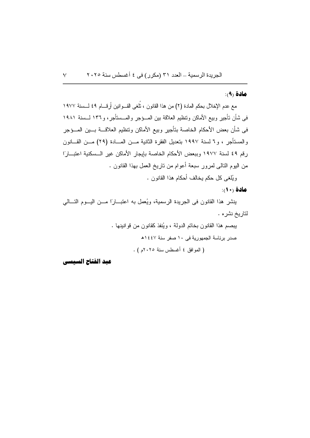 - العقود السكنية: تنتهي بعد 7 سنوات من تاريخ سريان القانون في أغسطس 2025.