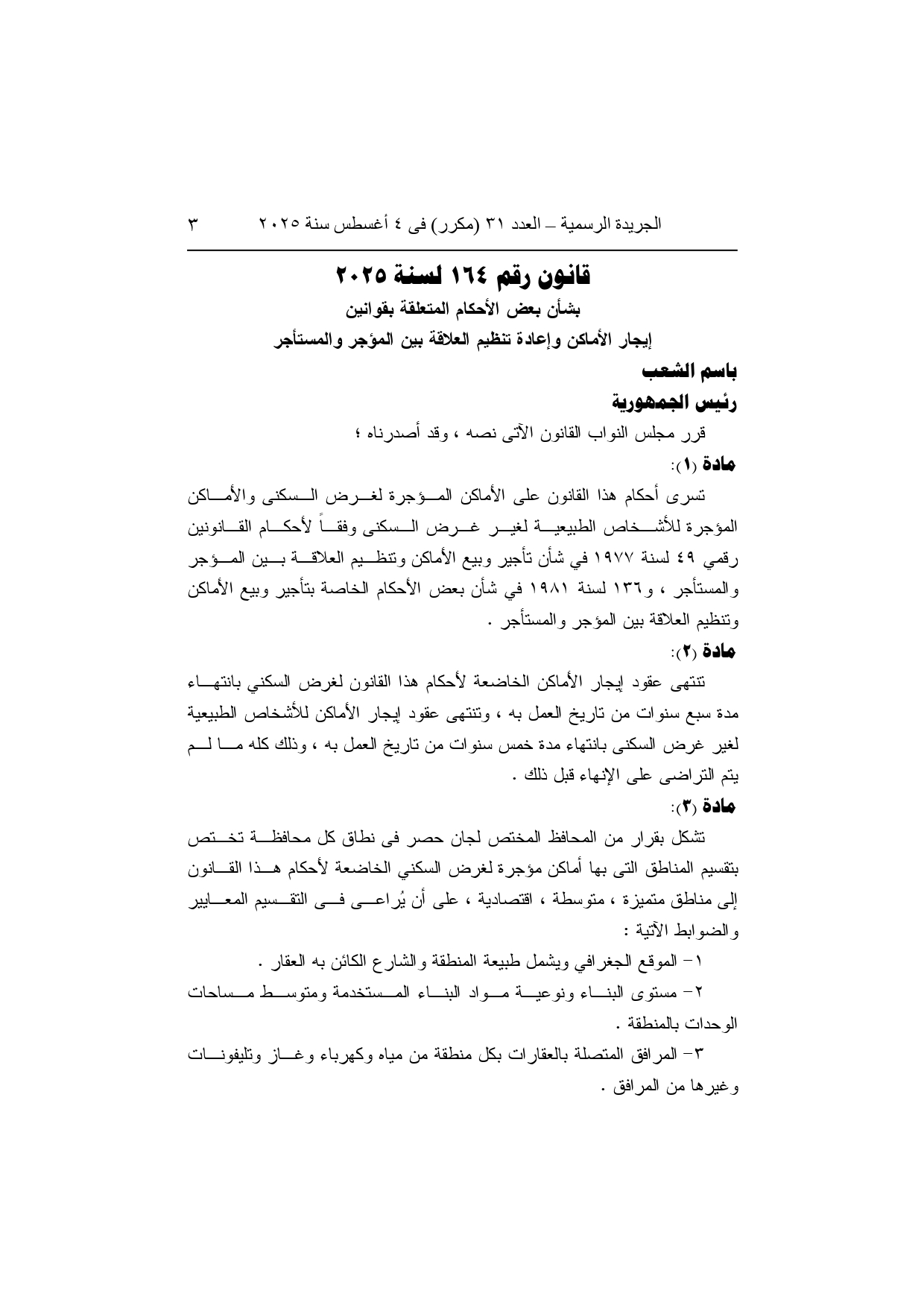نشرت الجريدة الرسمية في 4 أغسطس 2025 قرار رئيس جمهورية مصر العربية رقم 164 لسنة 2025، الذي ينظم عقود إيجار الأماكن ويعيد تنظيم العلاقة بين المؤجر والمستأجر المعروف بقانون الإيجار القديم.