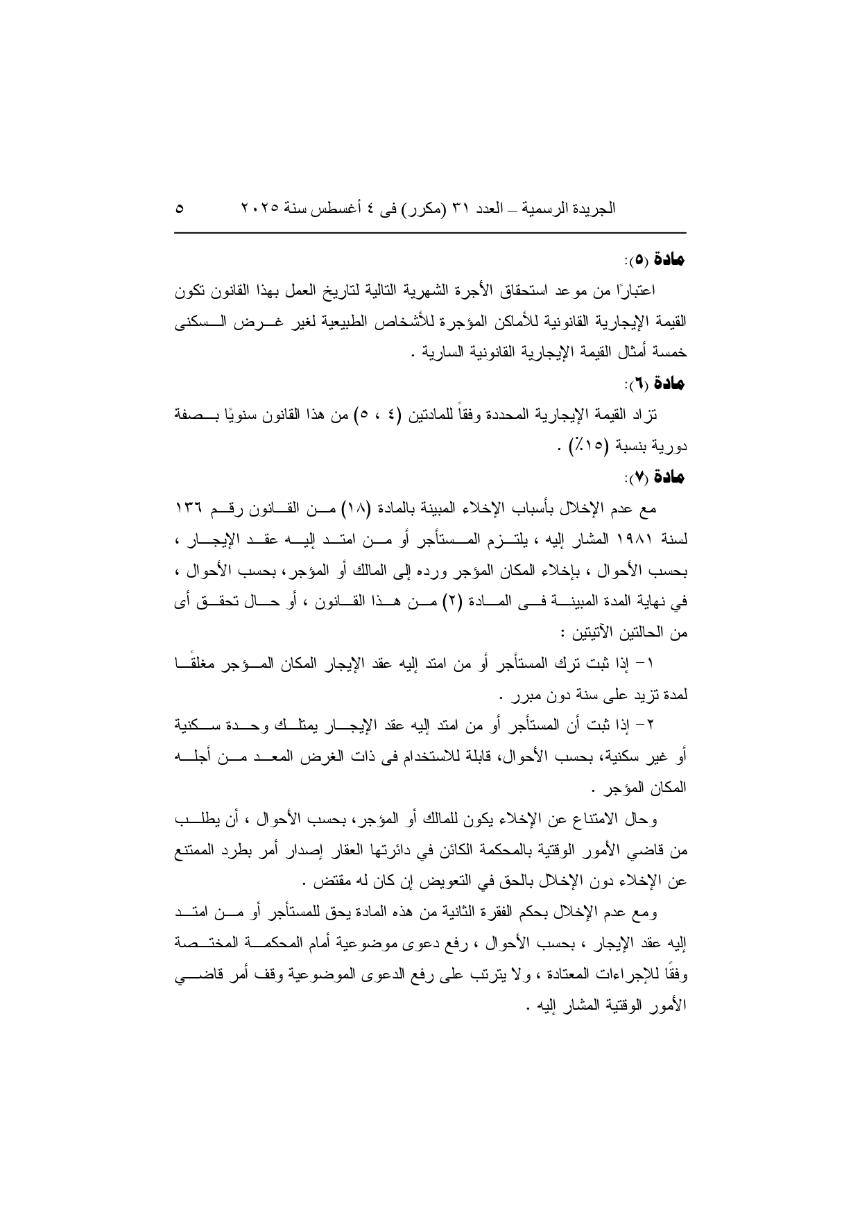- التزامات مالية: نص القانون على زيادة القيمة الإيجارية بمقدار 5 أمثال القيمة الحالية للأماكن غير السكنية كخطوة انتقالية.