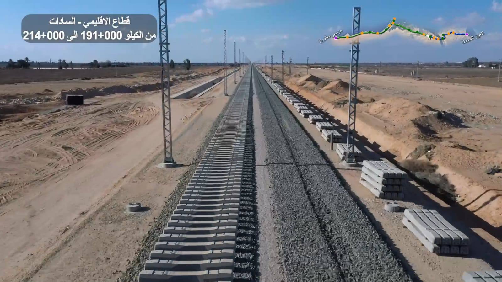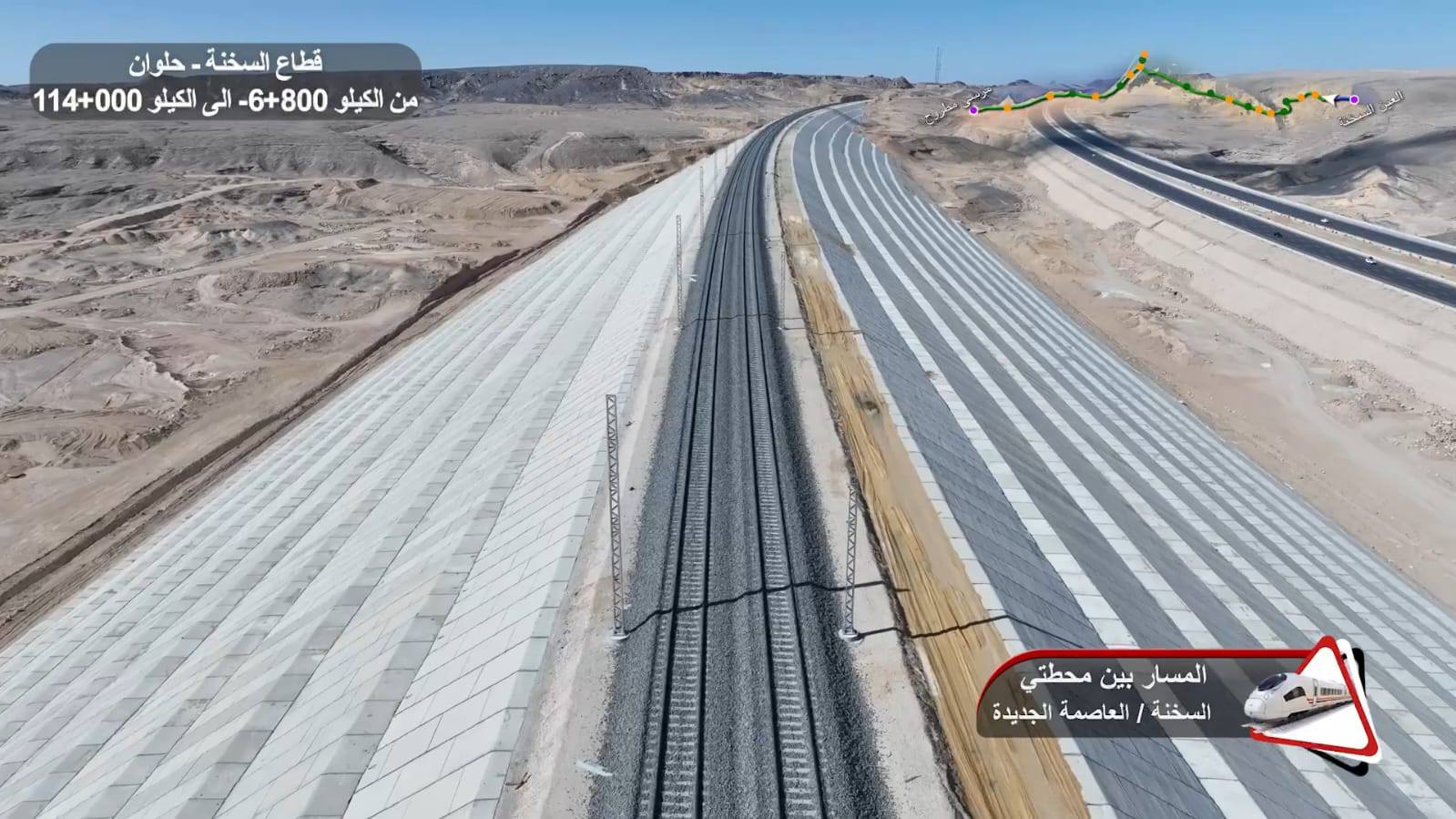 وتم الاطلاع على قطاعات المسار التي تم ويجري تسليمها لتحالف (سيمنز/ أوراسكوم/ المقاولون العرب)، لتنفيذ أعمال فرش البازلت وتركيب القضبان وأعمدة الكاتنيري الكهربائية ليتم بعدها تنفيذ الأعمال الكهروميكانيكية، حيث تم الانتهاء من تركيب قضبان السكة بطول 88.3 كم بقطاع شرق النيل وبطول 18 كم بقطاع غرب النيل وبطول 27 كم بالقطاع الشمالي، كما تم الانتهاء من تصنيع 21 قطار إقليمي (ديزيرو) من إجمالي 34 قطارا ووصل 8 قطارات منها مخصص للخط، وتم الانتهاء من تصنيع 7 قطارات سريعة (فيلارو) من إجمالي 15 قطارا ووصل 3 قطارات منها مخصص لهذا الخط، بالإضافة إلى أنه تم الانتهاء من تصنيع الجرارات الكهربائية للبضائع المخصصة لهذا الخط بإجمالي 14 جرارا.