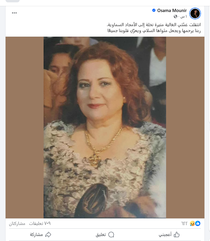 وكتب أسامة منير عبر حسابه بموقع التواصل الاجتماعي فيسبوك: انتقلت عمّتي الغالية منيرة نخلة إلى الأمجاد السماوية، ربنا يرحمها ويجعل مثواها السلام، ويعزّي قلوبنا جميعًا.