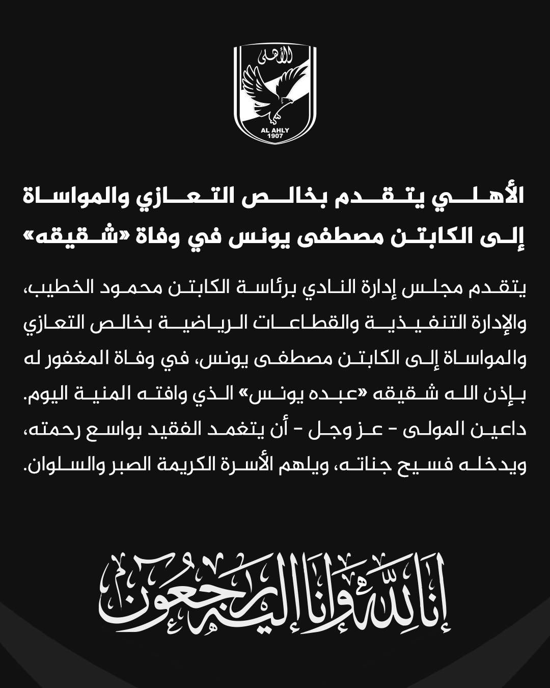 يتقدم مجلس إدارة النادي الأهلي برئاسة محمود الخطيب، والإدارة التنفيذية والقطاعات الرياضية بخالص التعازي والمواساة إلى اللاعب السابق مصطفى يونس، في وفاة شقيقه الأكبر الحاج عبده يونس، الذي وافته المنية صباح اليوم.