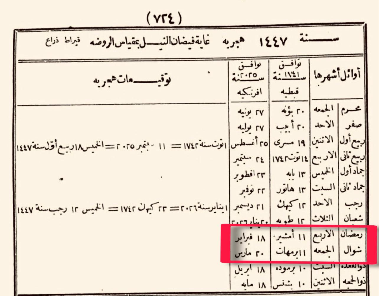 وكشف الكتاب “التوفيقات الإلهامية في مقارنة السنين الهجرية بالسنين الأفرنجية والقبطية"، لمؤلفه المصري محمد مختار باشا في عهد الخديوي عباس باشا الثاني، في العام 1311 هـ، الموافق عام 1893م، أن الأربعاء 18 فبراير 2026 سيكون هو أول أيام شهر رمضان 2026.