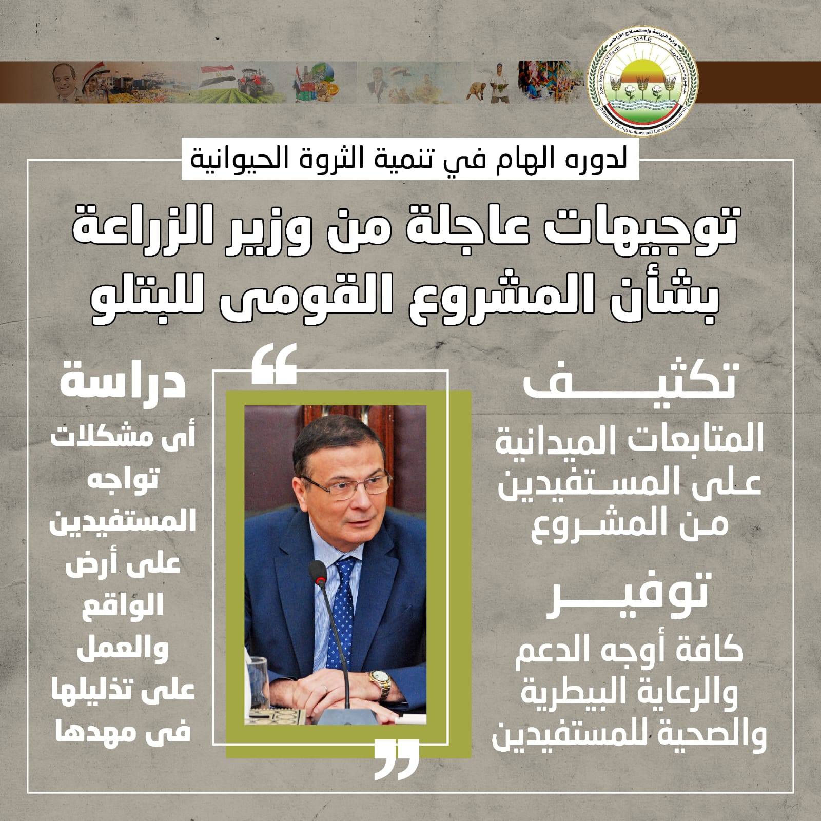 وكلف "فاروق" قطاع تنمية الثروة الحيوانية والداجنة والهيئة العامة للخدمات البيطرية بالتنسيق مع مديريات الزراعة والطب البيطري على مستوى محافظات الجمهورية بتكثيف المتابعات الميدانية على المستفيدين من المشروع القومى للبتلو، مع توفير كافة أوجه الدعم والرعاية البيطرية والصحية ودراسة أى مشكلات تواجه المستفيدين على أرض الواقع والعمل على تذليلها فى مهدها.