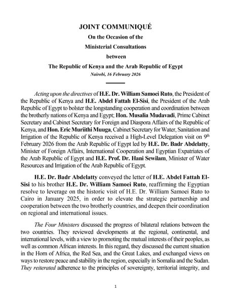 تنفيذاً لتوجيهات الرئيس عبد الفتاح السيسي، رئيس جمهورية مصر العربية، و السيد الدكتور ويليام ساموي روتو، رئيس جمهورية كينيا، لتعزيز التعاون والتنسيق المستمرين بين البلدين الشقيقين كينيا ومصر؛ استقبل موساليا مودافادي، رئيس مجلس الوزراء ووزير شئون الخارجية والمغتربين بجمهورية كينيا، والسيد إريك مورييثي، وزير المياه والصرف الصحي والري بجمهورية كينيا، وفدًا رفيع المستوى من جمهورية مصر العربية بتاريخ 9 فبراير 2026، برئاسة السيد الدكتور بدر عبد العاطي، وزير الخارجية والتعاون الدولي وشؤون المصريين بالخارج بجمهورية مصر العربية، والسيد الأستاذ الدكتور هاني سويلم، وزير الموارد المائية والري بجمهورية مصر العربية.
