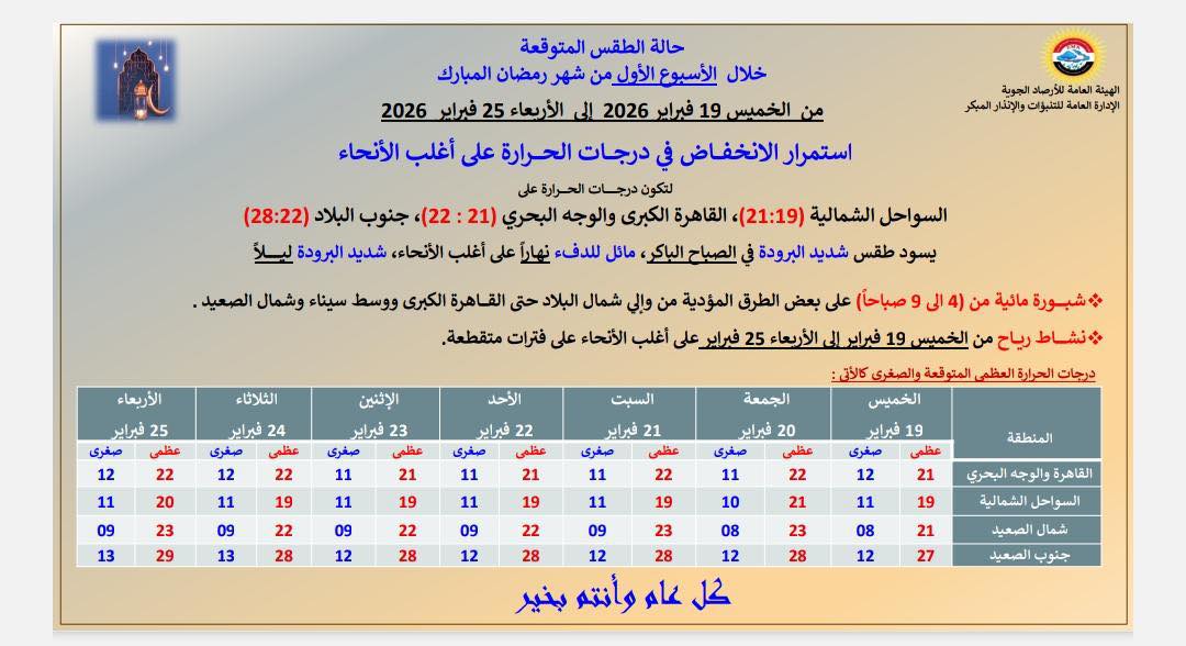 أعلنت الهيئة العامة للأرصاد الجوية عن حالة الطقس المتوقعة خلال الأسبوع الأول من شهر رمضان المبارك، وذلك في الفترة من الخميس 19 فبراير 2026، وحتى الأربعاء 25 فبراير 2026.