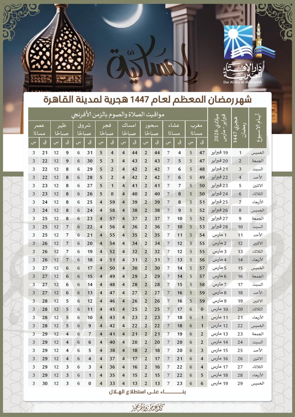 وفيما يلي ننشر إمساكية شهر رمضان 2026، لمدينة القاهرة، وفقا للحسابات الفلكية التي أعدها المعهد القومي للبحوث الفلكية، وعلى المقيمين خارج العاصمة مراعاة فروق التوقيت.