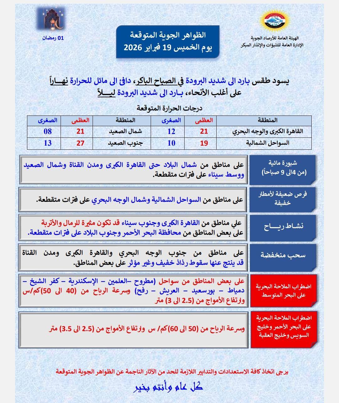 كشفت الهيئة العامة للأرصاد الجوية عن توقعات حالة الطقس المتوقعة خلال أول أيام شهر رمضان 2026.