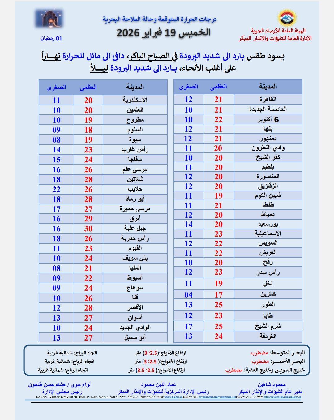وفيما يلي بيان بدرجات الحرارة المتوقعة الخميس على محافظات ومدن مصر: