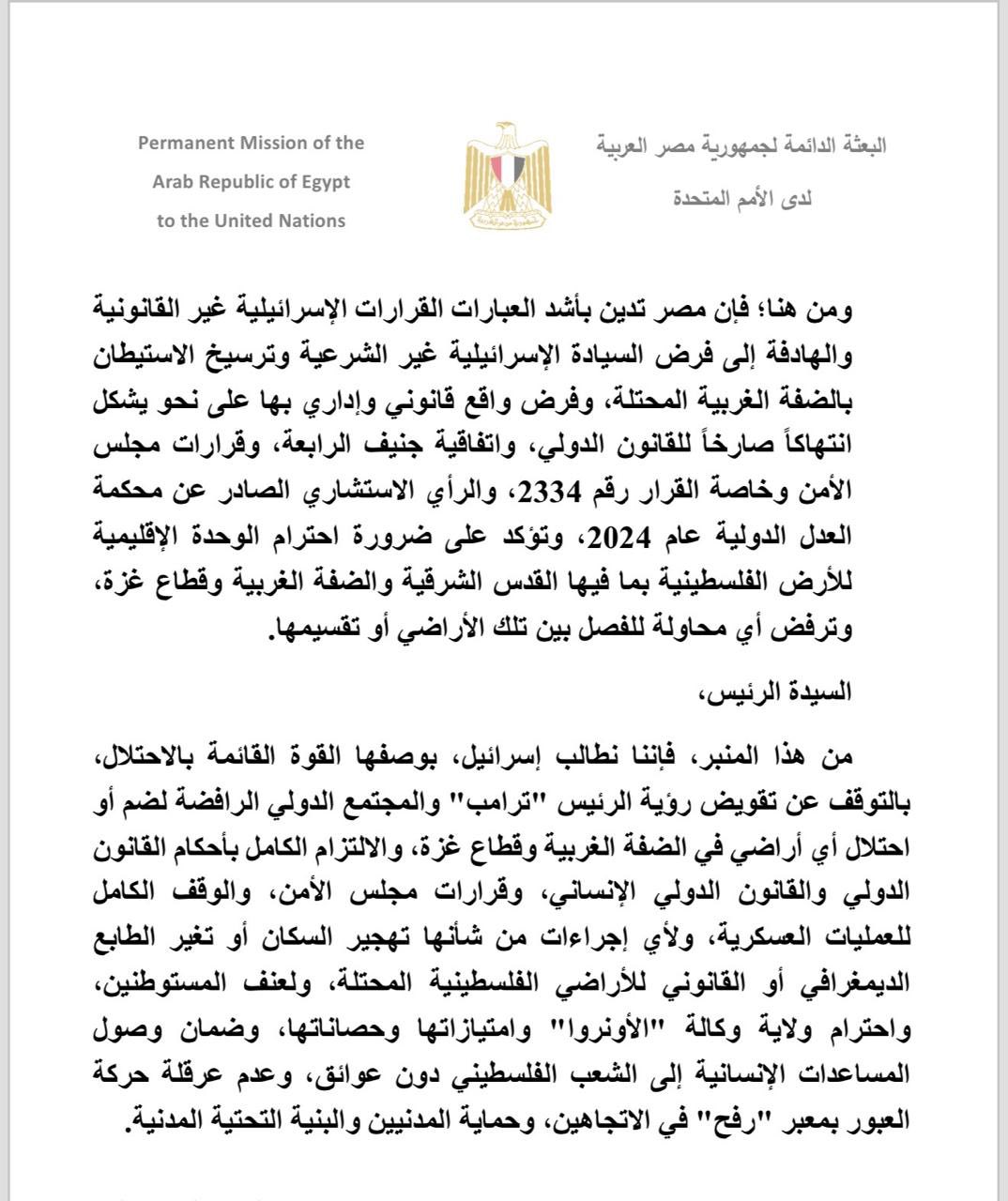 وقال عبد العاطي - في كلمته أمام جلسة عقدها مجلس الأمن الدولي، اليوم، بشأن الشرق الأوسط والقضية الفلسطينية - إن مصر تتطلع لشرق أوسط آمن ومستقر، وتطالب بالتصدي لكل الإجراءات الإسرائيلية التي تهدف لتهجير الشعب الفلسطيني، معلنا رفض مصر القاطع لأي محاولات لتصفية القضية.