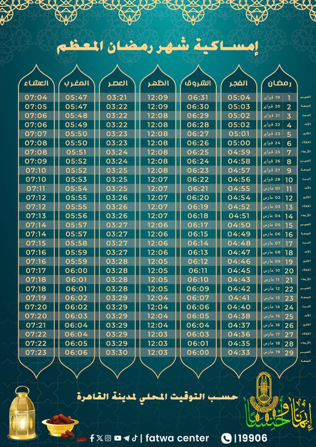 وفيما يلي ننشر إمساكية ثاني يوم في شهر رمضان 2026، لمدينة القاهرة، وفقاً للحسابات الفلكية التي أعدها المعهد القومي للبحوث الفلكية، وعلى المقيمين خارج العاصمة مراعاة فروق التوقيت.