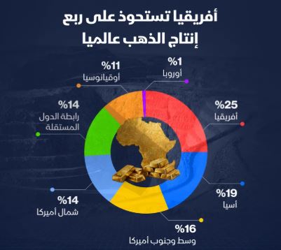 تصدرت قارة إفريقيا خريطة إنتاج الذهب عالميًا بحصة تبلغ 25%، وفق بيانات مجلس الذهب العالمي لمتوسط الإنتاج السنوي خلال الفترة من 2012 حتى 2021.