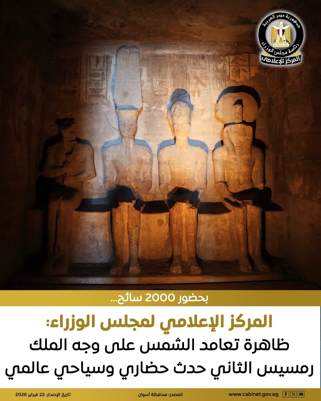 نشر المركز الإعلامي لمجلس الوزراء بيانًا عبر منصاته على مواقع التواصل الاجتماعي، أكد خلاله أنه تم صباح اليوم الأحد الموافق 22 فبراير، تنظيم الفعاليات الخاصة بظاهرة تعامد الشمس على وجه الملك رمسيس الثاني، وفقًا لكافة الترتيبات والضوابط المتبعة لهذا الحدث.