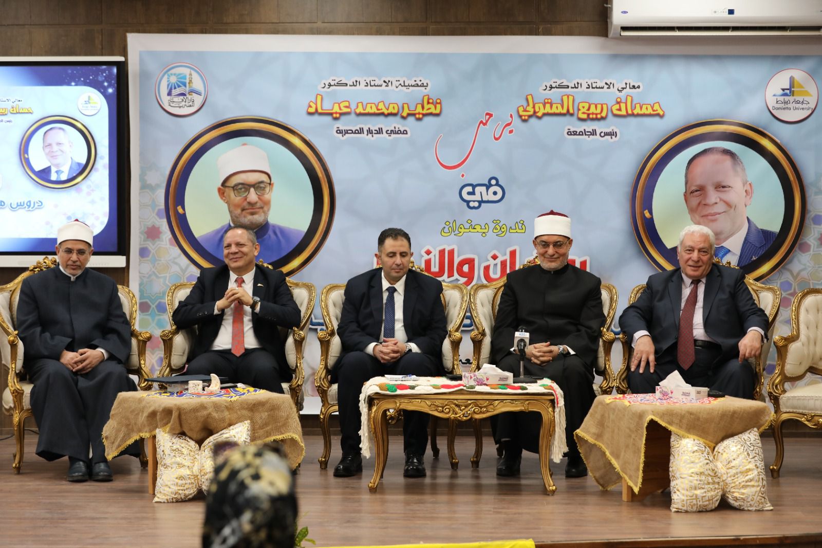 وفي ختام الندوة أهدى الدكتور حمدان ربيع المتولي، رئيس جامعة دمياط درعَ الجامعة لمفتي الجمهورية؛ تقديرًا لجهوده العلمية والدعوية ودَوره في تعزيز الوعي الديني والفكري وترسيخ قيم الانتماء الوطني.