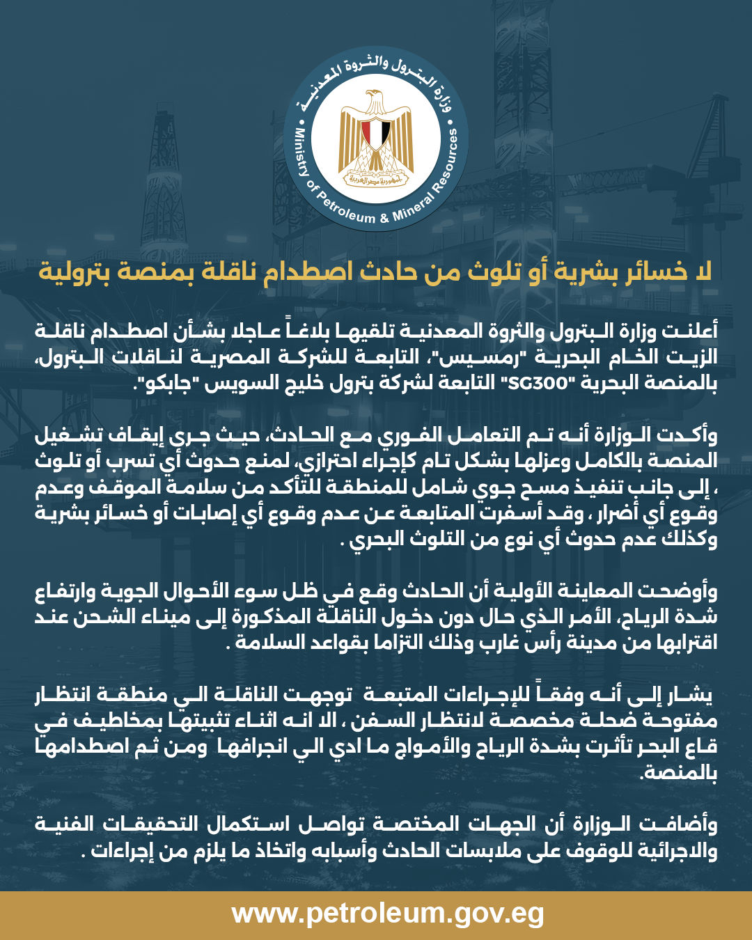 أعلنت وزارة البترول والثروة المعدنية، تلقيها بلاغاً عاجلا بشأن اصطدام ناقلة الزيت الخام البحرية "رمسيس"، التابعة للشركة المصرية لناقلات البترول، بالمنصة البحرية "SG300" التابعة لشركة بترول خليج السويس "جابكو".