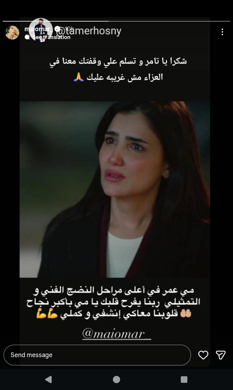 ونشر تامر حسني رسالة دعم عبر صفحته على إنستجرام قائلاً: «مي عمر في أعلى مراحل النضج الفني والتمثيلي، ربنا يفرح قلبك يا مي بأكبر نجاح، قلوبنا معك، إن شاء الله تشفي وكملي».