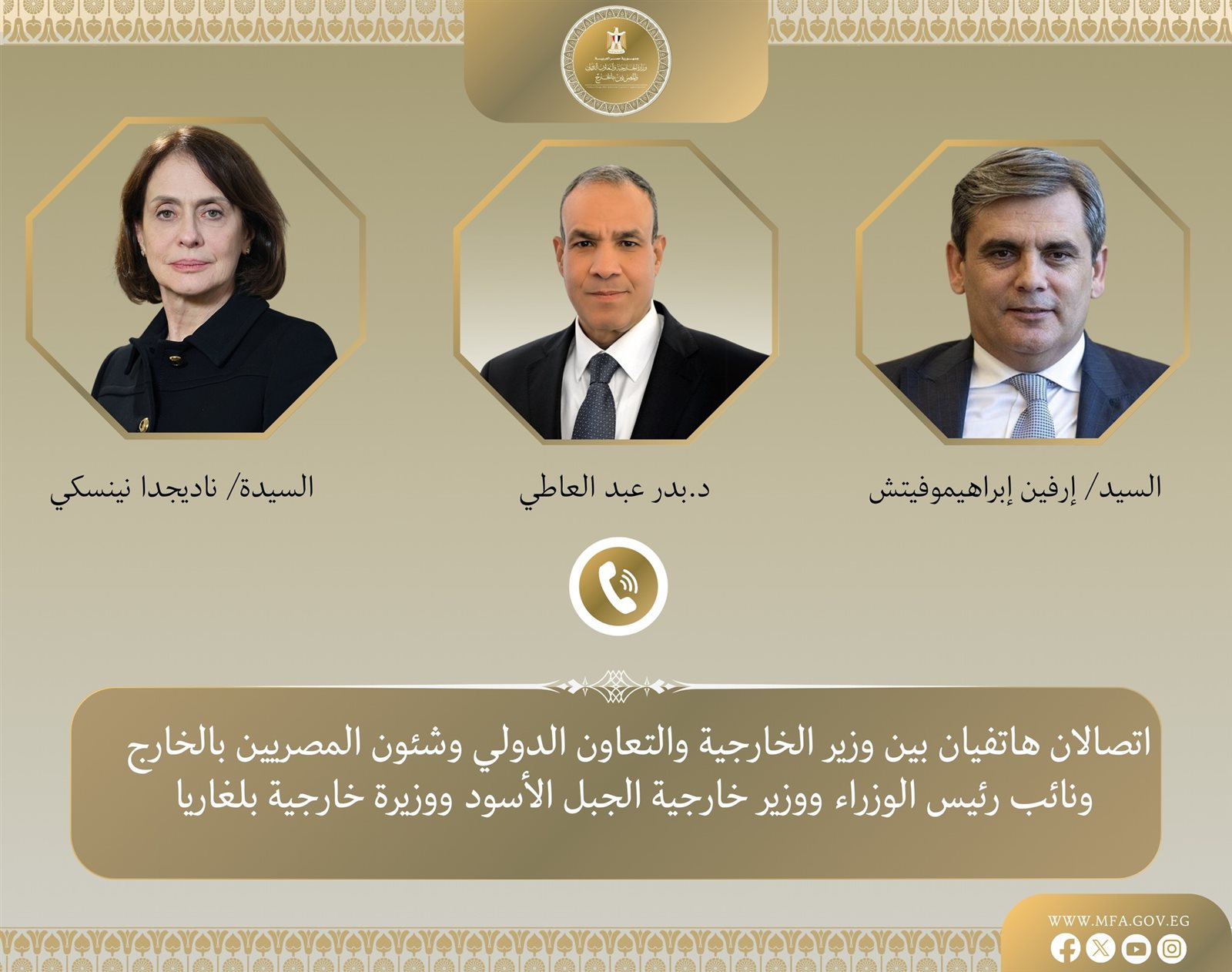 تلقى د. بدر عبدالعاطي وزير الخارجية والتعاون الدولي والمصريين بالخارج، اتصالين هاتفيين من ناديجدا نينسكي، وزيرة الخارجية بجمهورية بلغاريا، وإرفين إبراهيموفيتش، نائب رئيس الوزراء ووزير خارجية الجبل الأسود، وذلك لبحث تطورات التصعيد العسكري في المنطقة وتداعياته الوخيمة على الأمن والاستقرار الإقليميين.