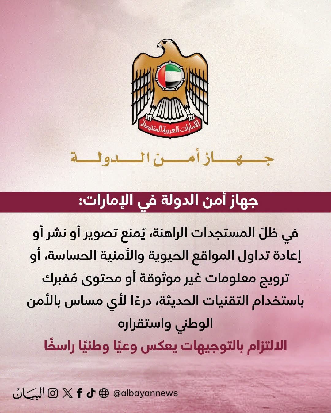 أكد جهاز أمن الدولة الإماراتي، الثلاثاء، حظر تصوير أو نشر أو إعادة تداول المواقع الحيوية والأمنية الحساسة، أو ترويج معلومات غير موثوقة أو محتوى مُفبرك باستخدام التقنيات الحديثة.