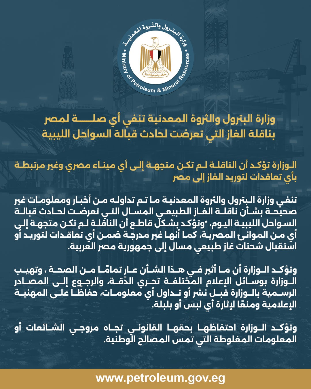 تنفي وزارة البترول والثروة المعدنية ما تم تداوله من أخبار ومعلومات غير صحيحة بشأن ناقلة الغاز الطبيعي المسال التي تعرضت لحادث قبالة السواحل الليبية اليوم الأربعاء، وتؤكد بشكل قاطع أن الناقلة لم تكن متجهة إلى أي من الموانئ المصرية، كما أنها غير مدرجة ضمن أي تعاقدات لتوريد أو استقبال شحنات غاز طبيعي مسال إلى جمهورية مصر العربية.