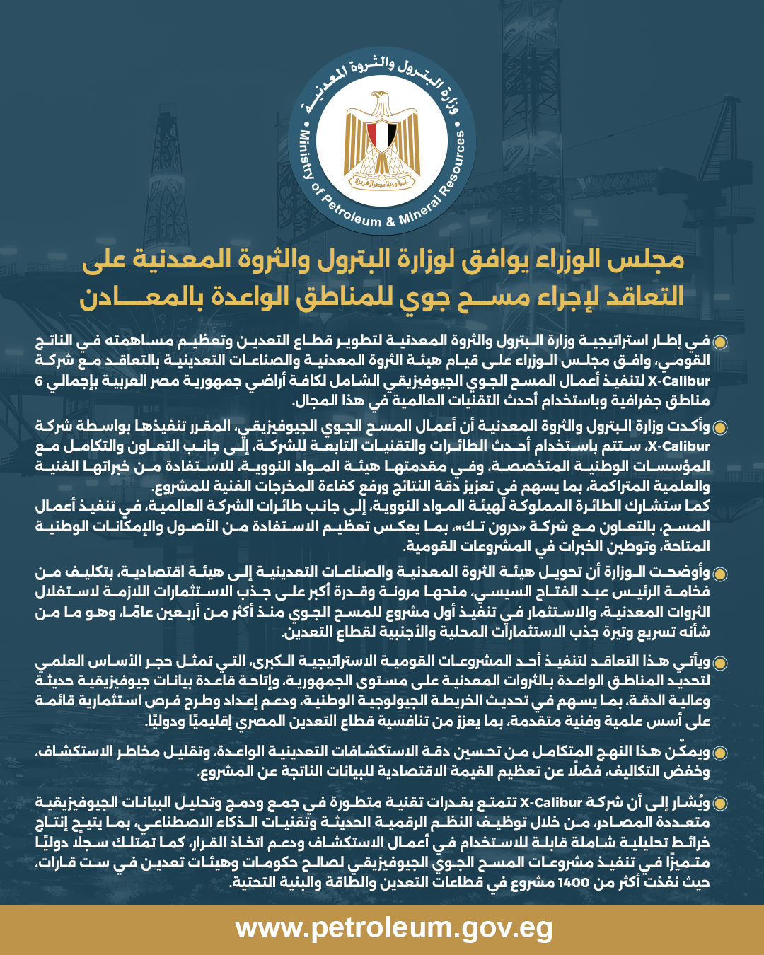 وافق مجلس الوزراء على قيام هيئة الثروة المعدنية والصناعات التعدينية بالتعاقد مع شركة X-Calibur لتنفيذ أعمال المسح الجوي الجيوفيزيقي الشامل لكافة أراضي جمهورية مصر العربية بإجمالي 6 مناطق جغرافية وباستخدام أحدث التقنيات العالمية في هذا المجال.