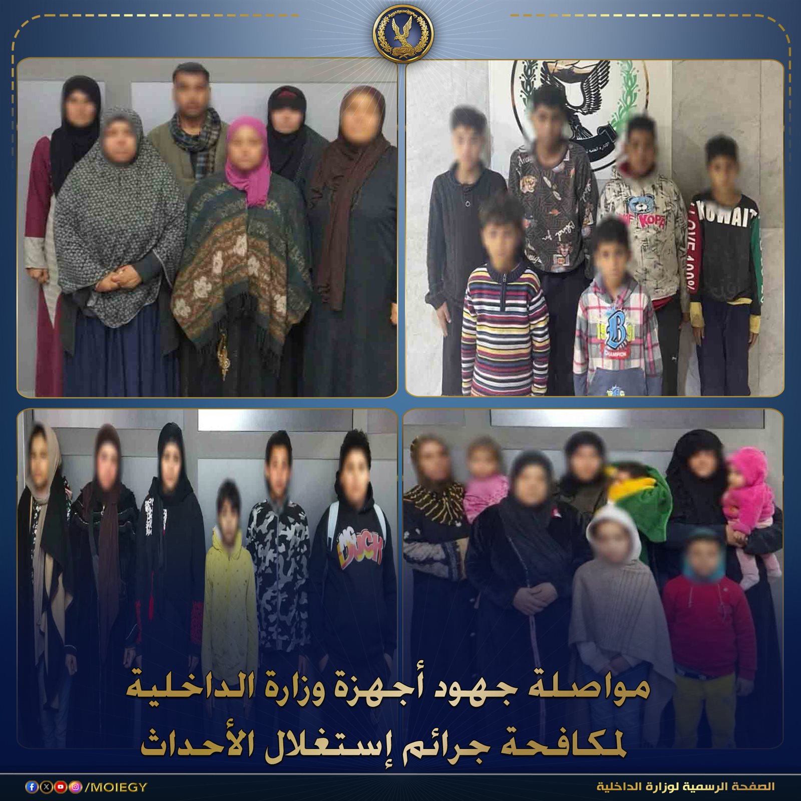 تمكنت الإدارة العامة لمباحث رعاية الأحداث بقطاع الشرطة المتخصصة من ضبط (رجل ، 9 سيدات – لـ 5 منهم معلومات جنائية) لقيامهم باستغلال الأطفال الأحداث في أعمال التسول واستجداء المارة وبيع السلع بطريقة إلحاحية بنطاق محافظة الجيزة ، وبصحبتهم (17 حدثًا) من المعرضين للخطر حال قيامهم ببيع السلع بشكل إلحاحى والتسول وبمواجهتهم اعترفوا بنشاطهم الإجرامى.