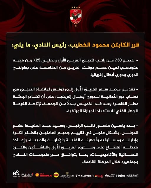 وقرر الكابتن محمود الخطيب رئيس النادي الأهلي خصم 30% من راتب لاعبي الفريق الأول و25% من قيمة عقودهم، وذلك لحين حسم موقف الفريق من المنافسة على بطولتي الدوري المصري الممتاز ودوري أبطال أفريقيا.