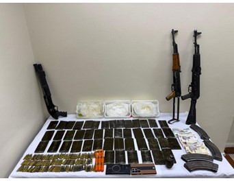 وعُثر بحوزته على بندقيتين آليتين وبندقية خرطوش، بالإضافة إلى 8 كيلوجرامات من المواد المخدرة المتنوعة (حشيش وشابو).