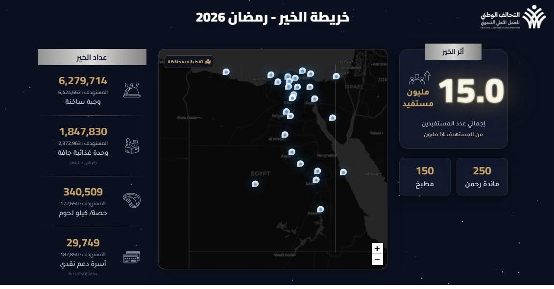 و شملت الخدمات المنفذة على "خريطة الخير" حتى نهاية الأسبوع الثالث ما يلي: ٦,٢٧٩,٧١٤ وجبة ساخنة، وتوزيع ١,٨٤٧,٨٣٠ وحدة غذائية جافة (كراتين وشنط مواد غذائية)، وتوزيع ٣٤٠,٥٠٩ حصة/ كيلو من اللحوم، بالإضافة إلى تقديم الدعم النقدي لـ ٢٩,٧٤٩ أسرة ضمن برامج الحماية الاجتماعية، وذلك عبر تشغيل ٢٥٠ مائدة رحمن و ١٥٠ مطبخاً مركزياً.