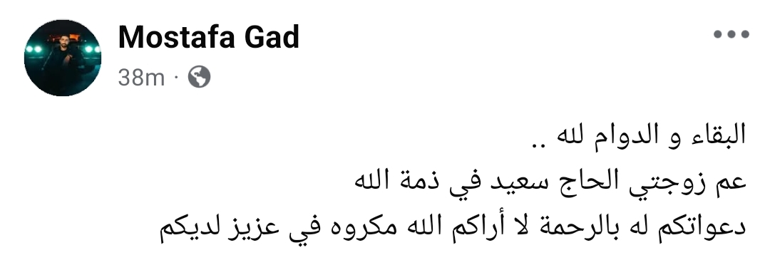 وكتب زوج كارمن سليمان : "البقاء والدوام لله .. عم زوجتي الحاج سعيد في ذمة الله .. دعواتكم له بالرحمة .. لا أراكم الله مكروه في عزيز لديكم".