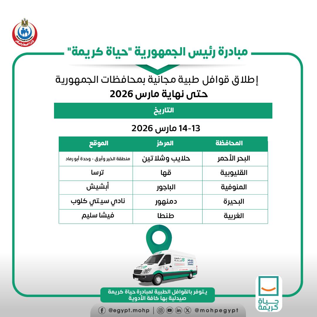 أعلنت وزارة الصحة والسكان، عن إطلاق قوافل طبية مجانية بمحافظات الجمهورية حتى نهاية مارس 2026، ضمن مبادرة رئيس الجمهورية «حياة كريمة»، في تخصصات طبية متعددة، لتقديم الخدمات الصحية اللائقة للمواطنين، لاسيما الأسر الأكثر احتياجًا.