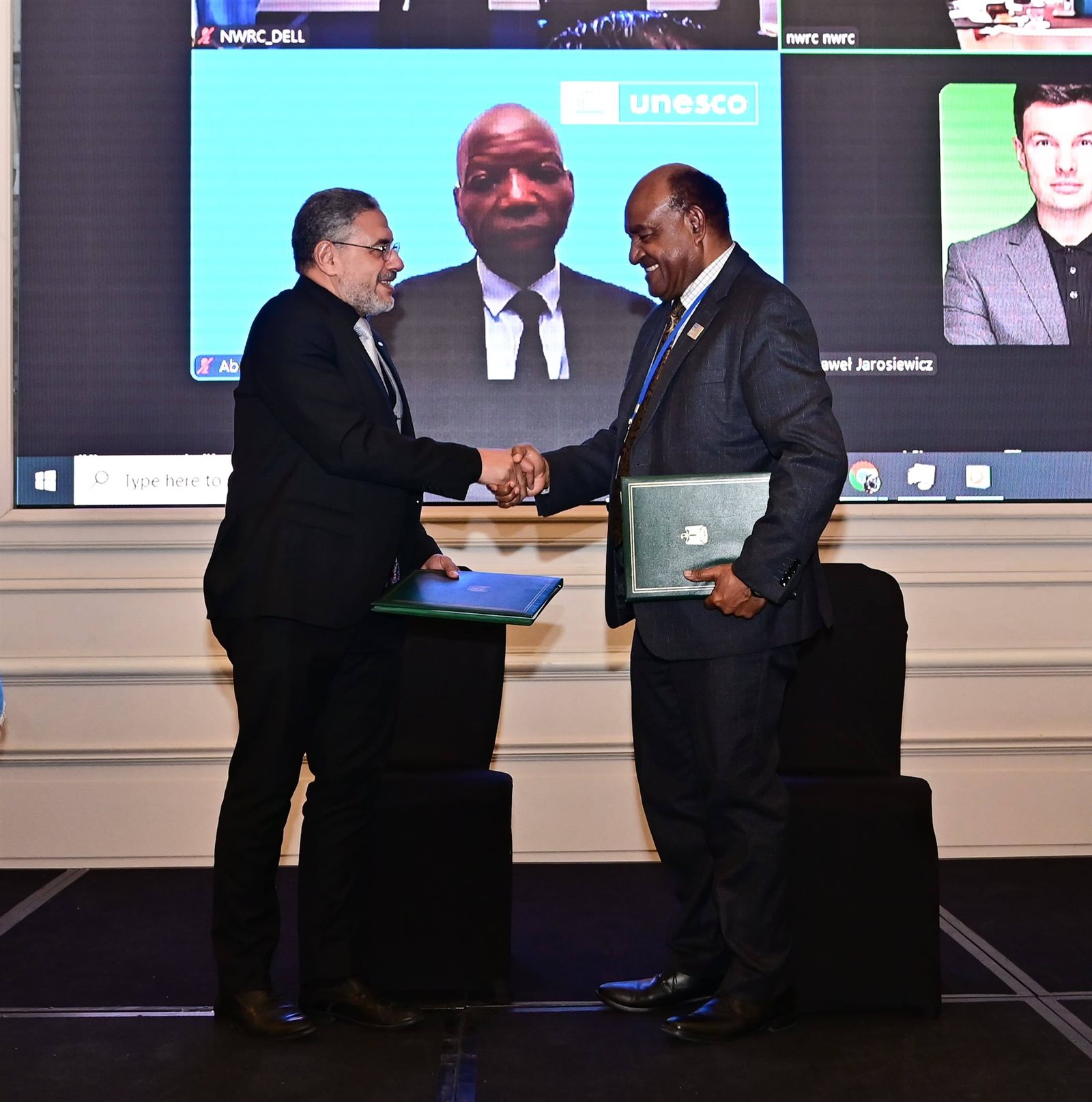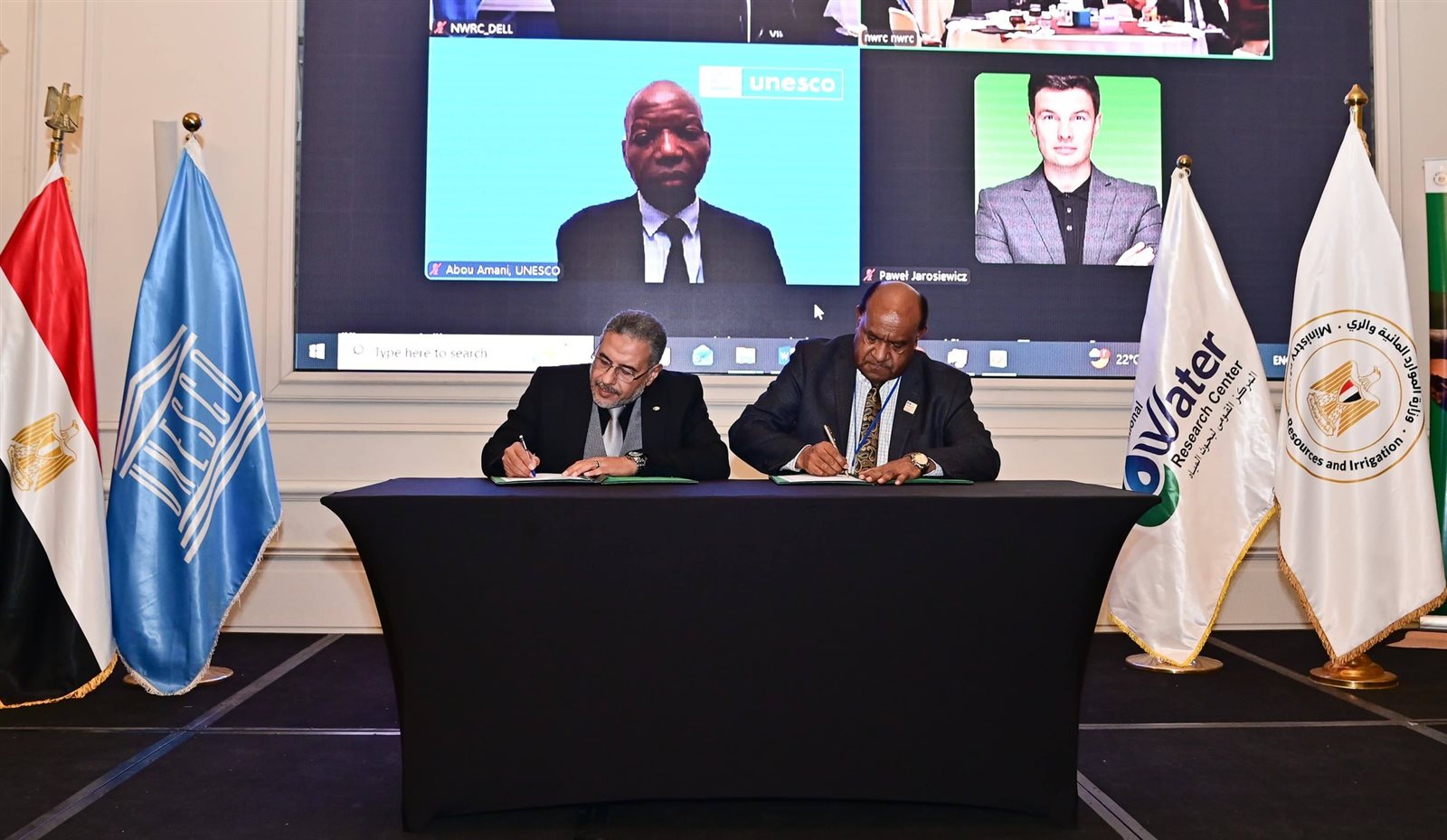 وشهد الوزراء مراسم توقيع «اتفاقية كرسي اليونسكو لإدارة وحوكمة المياه العابرة للحدود بالمركز القومي لبحوث المياه»، التي وقعها كل من روبرتو بورا، المدير الإقليمى لمكتب اليونسكو القاهرة، والدكتور شريف محمدي، رئيس المركز القومي لبحوث المياه.