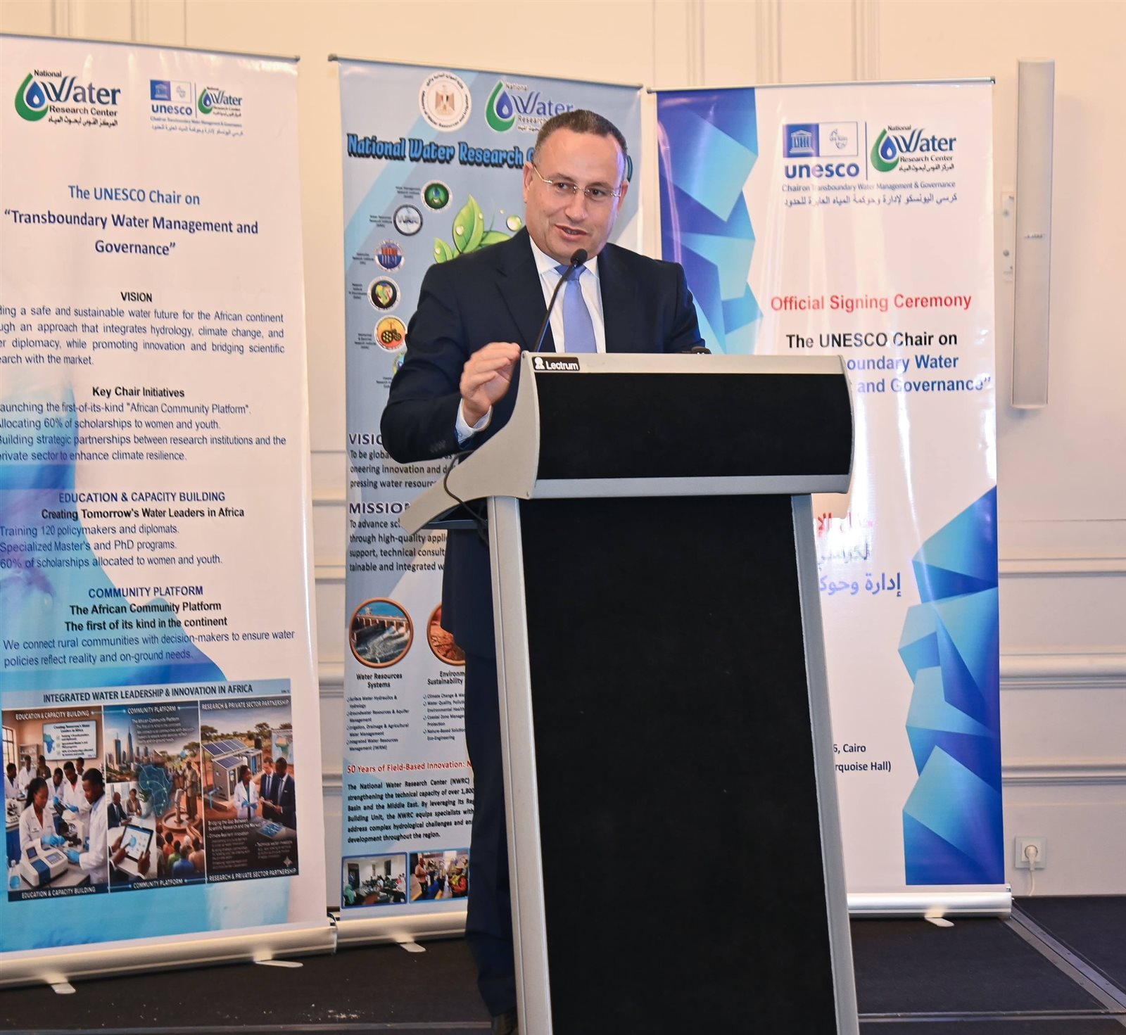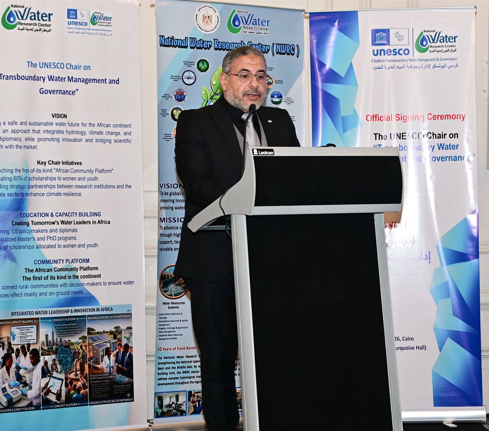 وفي كلمته، أكد الدكتور شريف محمدي، رئيس المركز القومي لبحوث المياه، أن استضافة المركز لهذا الكرسي يُمثل خطوة مهمة لتعزيز البحث العلمي والتعاون الدولي لمواجهة تحديات المياه في إفريقيا، مُشيرًا إلى أن المركز بما يمتلكه من خبرات علمية وبنية بحثية متقدمة سيعمل على تطوير أدوات علمية لدعم متخذي القرار وتعزيز الإدارة المستدامة للموارد المائية، مع توسيع الشراكات مع المنظمات الدولية ومراكز البحث والقطاع الخاص لدعم الابتكار وتحقيق الأمن المائي الإقليمي.