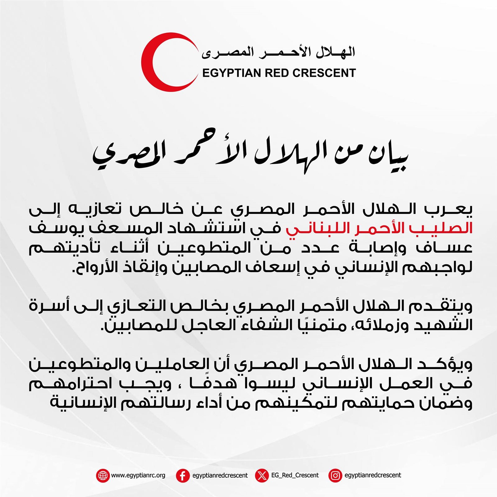 أعرب الهلال الأحمر المصري، عن خالص تعازيه إلى الصليب الأحمر اللبناني في استشهاد المسعف يوسف عباس، وإصابة عدد من المتطوعين أثناء تأديتهم واجبهم الإنساني في إسعاف المصابين وإنقاذ الأرواح.