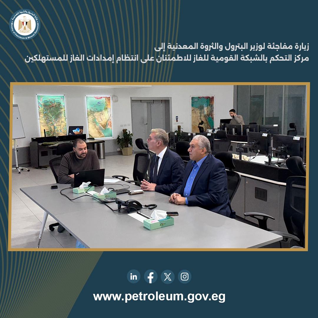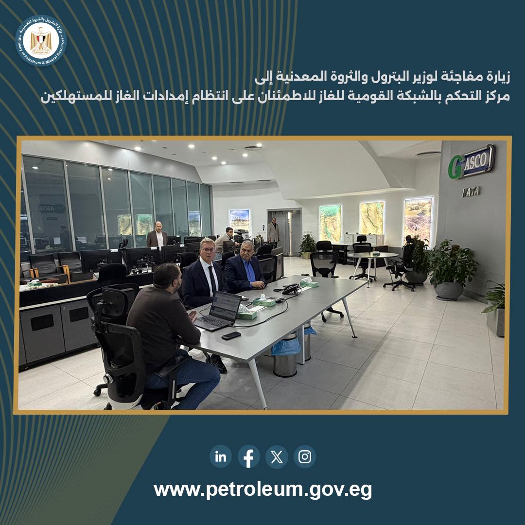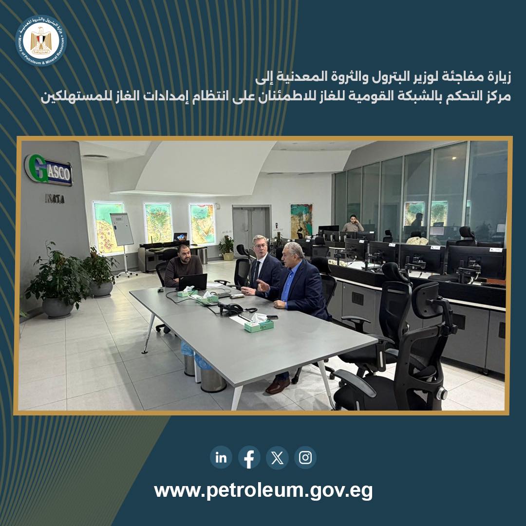 أجرى المهندس كريم بدوي، وزير البترول والثروة المعدنية، زيارة مفاجئة إلى مركز التحكم بالشبكة القومية للغاز الطبيعي «ناتا» بمقر شركة جاسكو، وذلك للاطلاع على الموقف التشغيلي الفعلي للشبكة القومية لنقل الغاز الطبيعي، والاطمئنان على انتظام ضخ إمدادات الغاز عبر الشبكة إلى مختلف قطاعات الاستهلاك، وفي مقدمتها قطاع الكهرباء والصناعة، بما يضمن تلبية الاحتياجات بصورة مستقرة وآمنة.