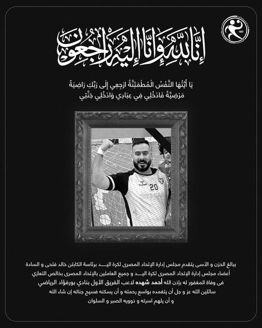 وتوفي في ساعة مبكرة من صباح اليوم أحمد شهدة لاعب فريق كرة اليد بنادي بورفؤاد، بعد ساعات من احتفاله بالتأهل مع فريقه لدور الـ8 بالدوري الممتاز.