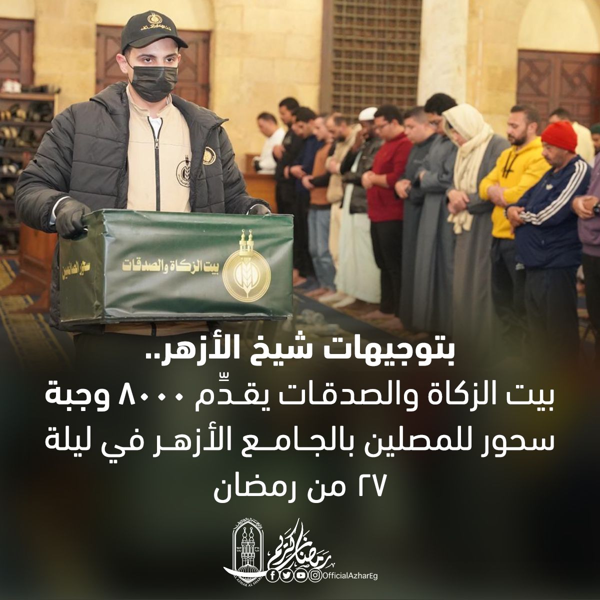 بتوجيهات من فضيلة الإمام الأكبر شيخ الأزهر الشريف الدكتور أحمد الطيب، أعلن «بيت الزكاة والصدقات» زيادة عدد وجبات السحور التي سيوزِّعها على رواد الجامع الأزهر في ليلة الـ27 من شهر رمضان المبارك، الذين سيتوافدون لصلاة التراويح وصلاة التهجد وإحياء ليلة القدر، إلى 8000 وجبة.