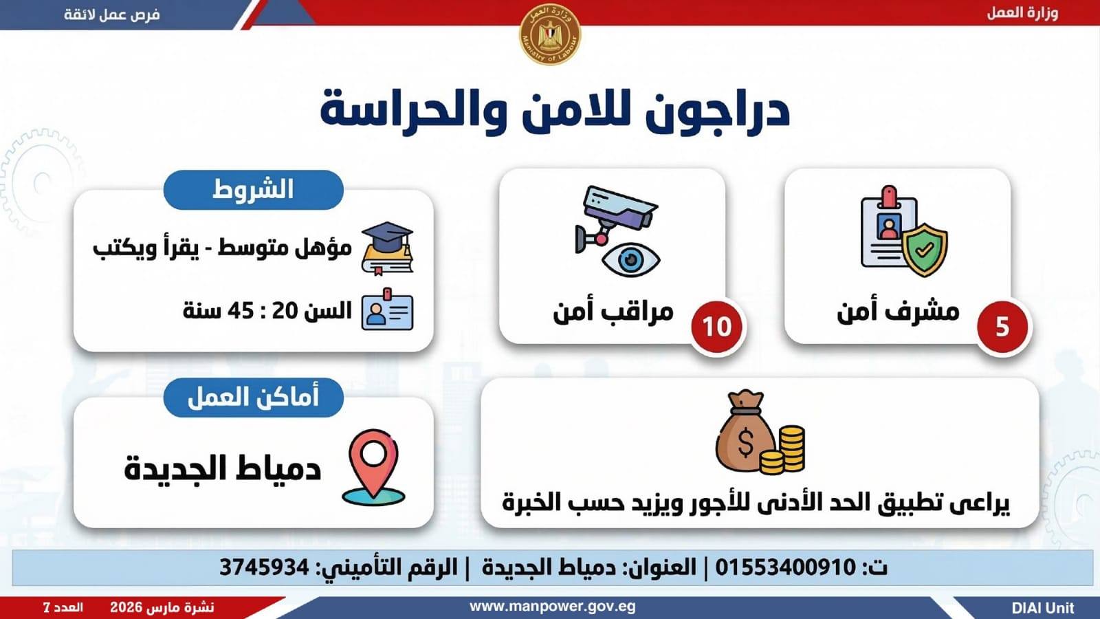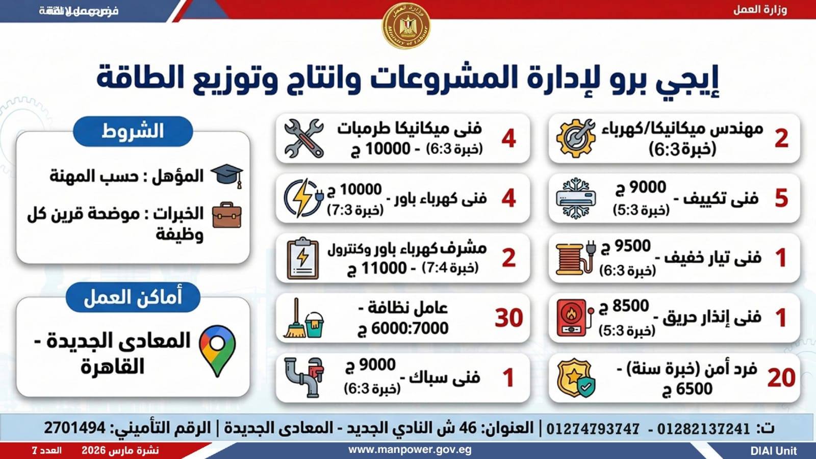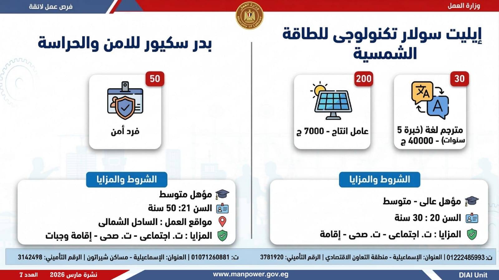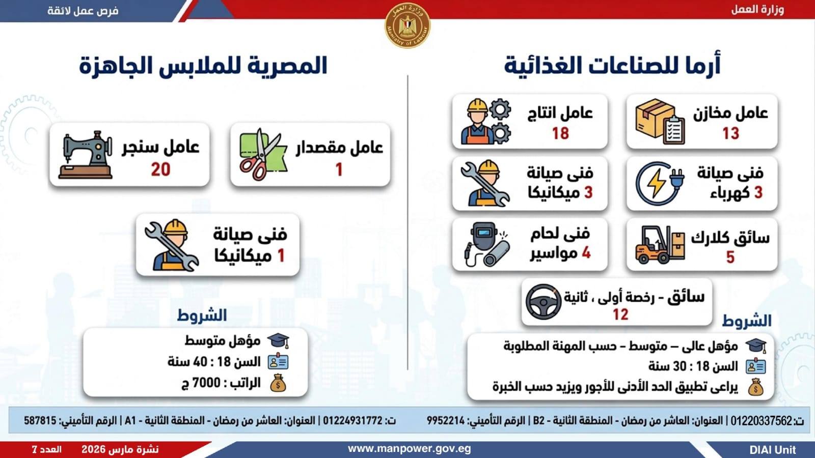 أعلنت وزارة العمل، اليوم، عن إطلاق نشرة التوظيف الأسبوعية متضمنة 1721 فرصة عمل، بالتعاون مع 33 شركة من شركات القطاع الخاص، موزعة على 8 محافظات، مع فتح باب التقديم خلال شهر مارس 2026 الجاري.