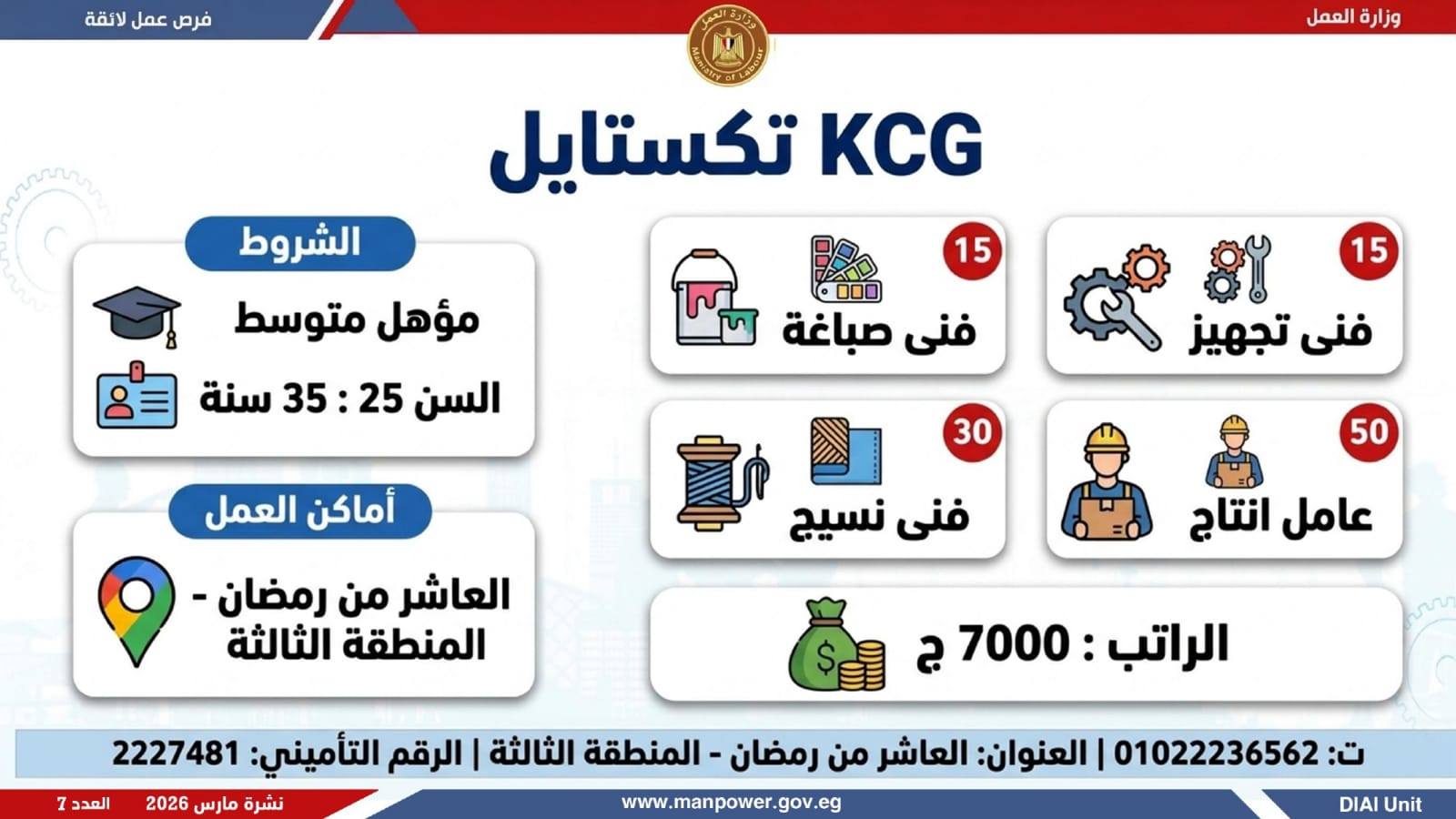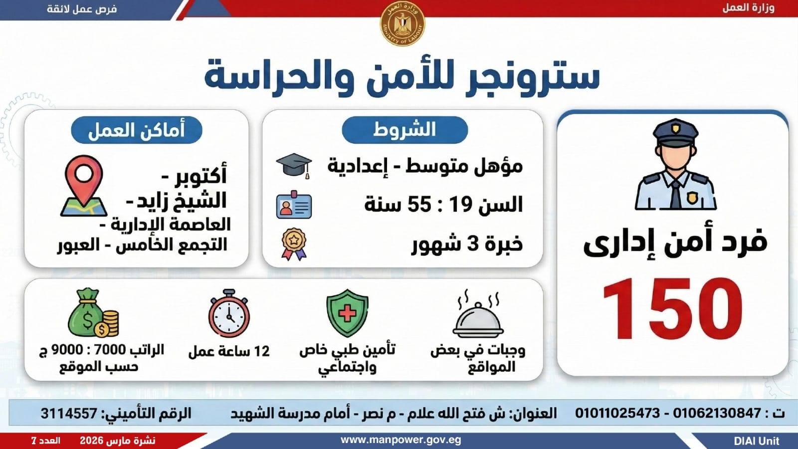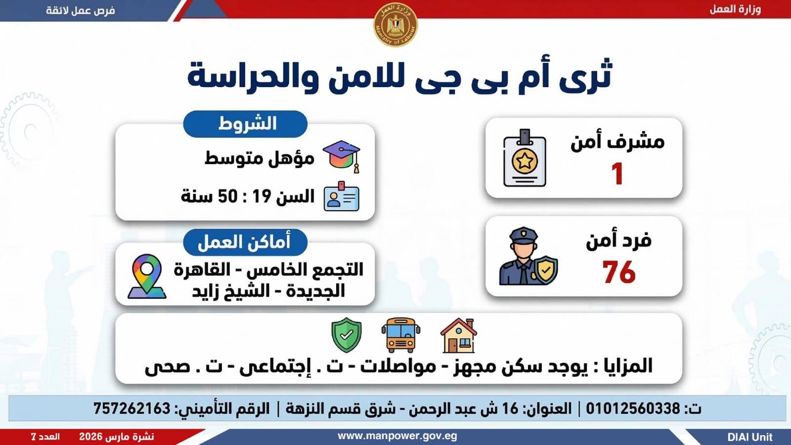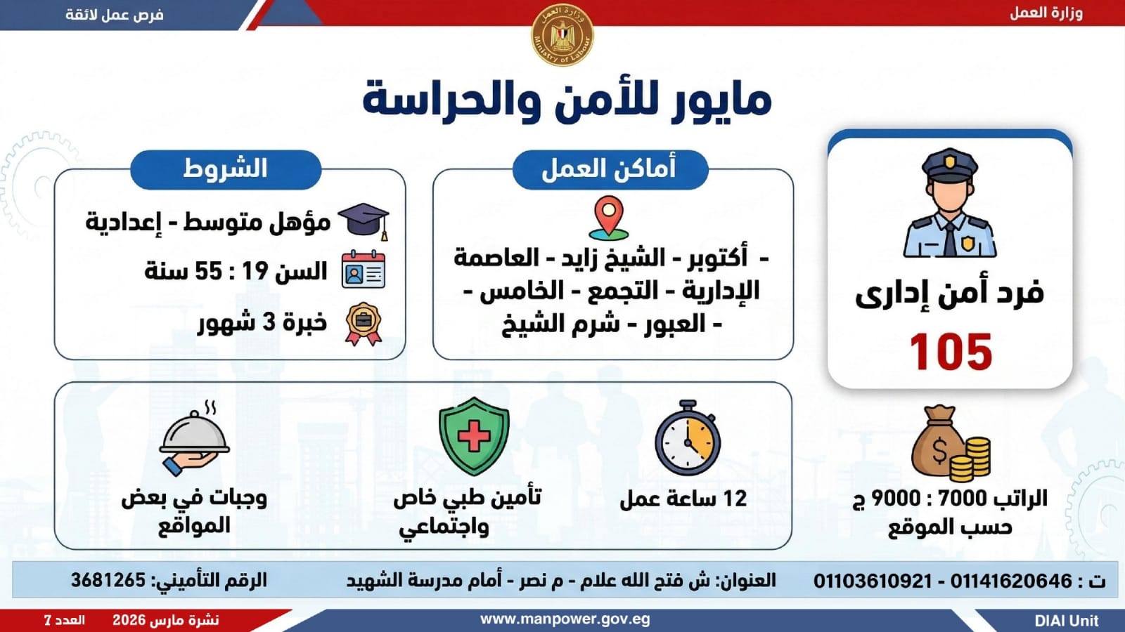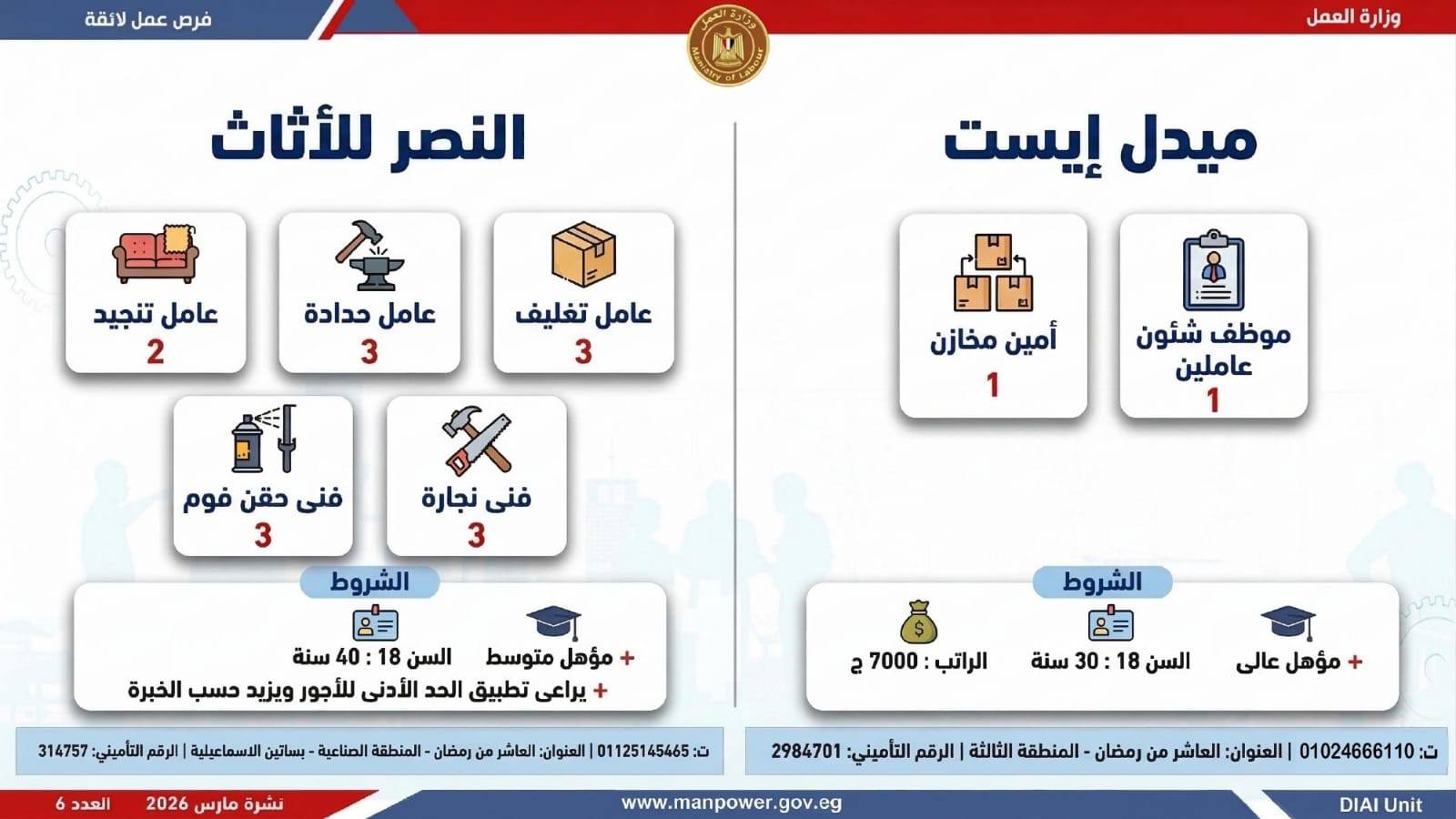 أعلنت وزارة العمل، اليوم، عن إطلاق نشرة التوظيف الأسبوعية متضمنة 1721 فرصة عمل، بالتعاون مع 33 شركة من شركات القطاع الخاص، موزعة على 8 محافظات، مع فتح باب التقديم خلال شهر مارس 2026 الجاري.