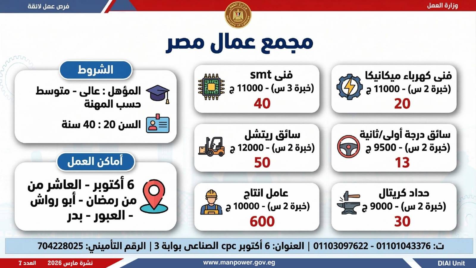 كما جدّد دعوته لشباب مصر للإقبال على العمل بالقطاع الخاص، مؤكدًا أن الدولة توفر برامج تدريب مهني مجانية تؤهل الشباب لوظائف المستقبل وفق احتياجات سوق العمل...وبيّنت الوزارة أن التقديم يتم عبر الإدارة العامة للتشغيل بمقر الوزارة القديم بمدينة نصر، أو من خلال مديريات العمل بالمحافظات، أو مباشرة عبر بيانات الشركات المرفقة بالنشرة.