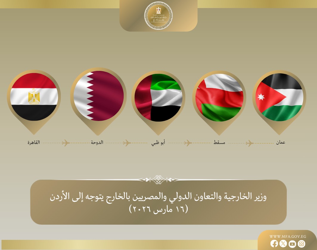 توجه د. بدر عبدالعاطي وزير الخارجية والتعاون الدولي والمصريين بالخارج، إلى العاصمة الأردنية عَمّان، اليوم، في رابع محطة من جولته لنقل رسالة تضامن ودعم كامل للمملكة الأردنية الهاشمية في ظل التحديات الأمنية التي تشهدها المنطقة.