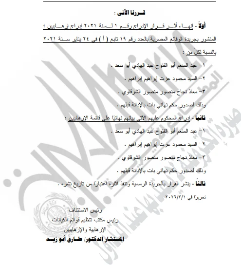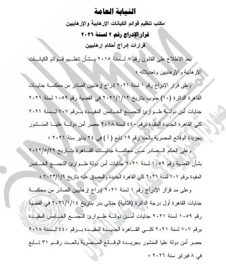 وجاء القرار رقم 2 لسنة 2026 الصادر عن مكتب تنظيم قوائم الكيانات الإرهابية والإرهابيين، بعد الاطلاع على القانون رقم 8 لسنة 2015 بشأن تنظيم قوائم الكيانات الإرهابية والإرهابيين وتعديلاته، وعلى قرار الإدراج رقم 1 لسنة 2021 الصادر من محكمة جنايات القاهرة الدائرة (10) جنوب بتاريخ 12 يناير 2021 في القضية رقم 1059 لسنة 2021 جنايات أمن دولة طوارئ التجمع الخامس، المقيدة برقم 707 لسنة 2021 كلي القاهرة الجديدة، والمقيدة برقم 440 لسنة 2018 حصر أمن دولة عليا، والمنشور بجريدة الوقائع المصرية بالعدد رقم 19 تابع (أ) في 24 يناير 2021.