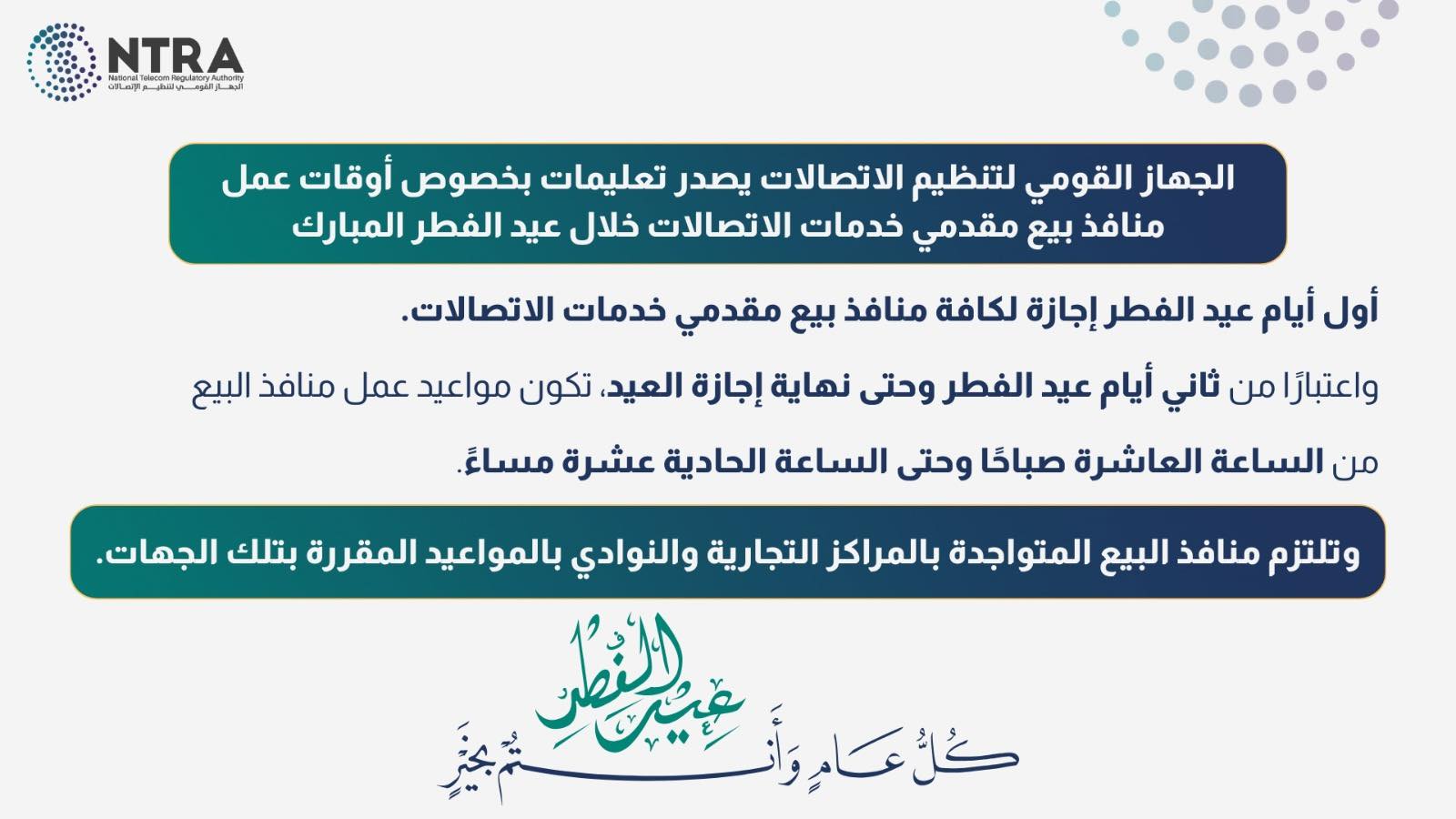 - أول أيام العيد: إجازة رسمية لجميع منافذ بيع مقدمي خدمات الاتصالات.