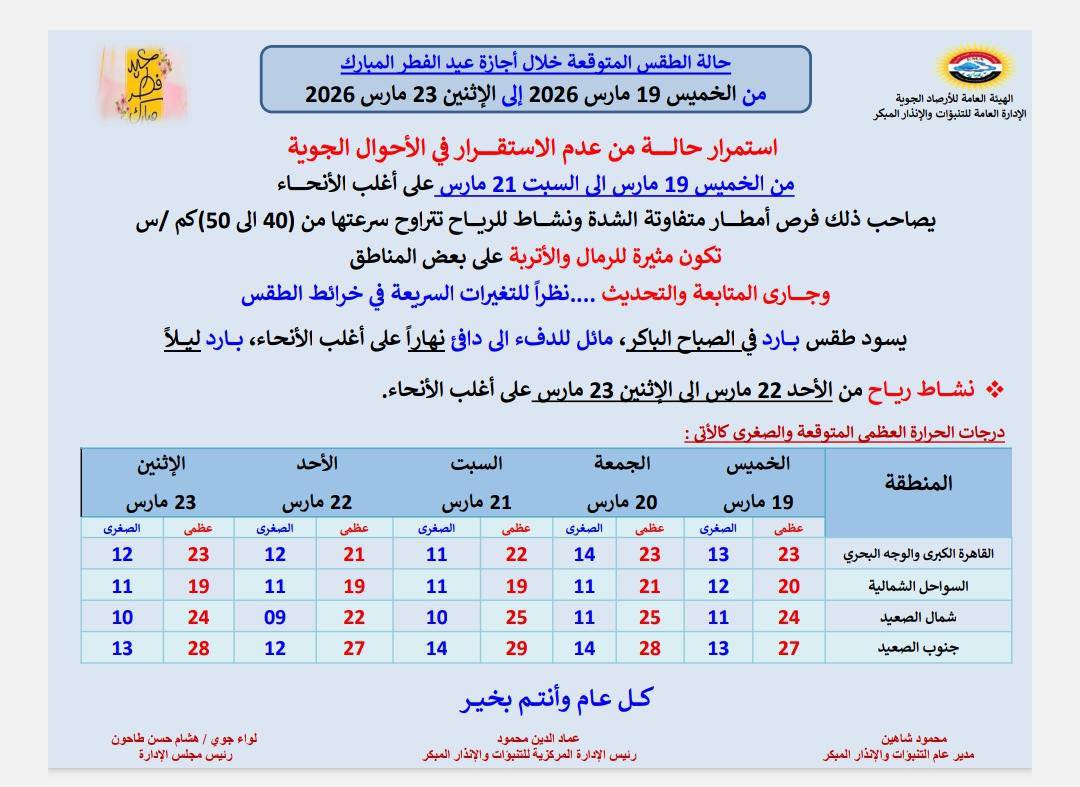 كشفت الهيئة العامة للأرصاد الجوية عن توقعاتها لحالة الطقس خلال إجازة عيد الفطر المبارك 2026، مؤكدة استمرار حالة عدم الاستقرار في الأحوال الجوية خلال الأيام المقبلة.
