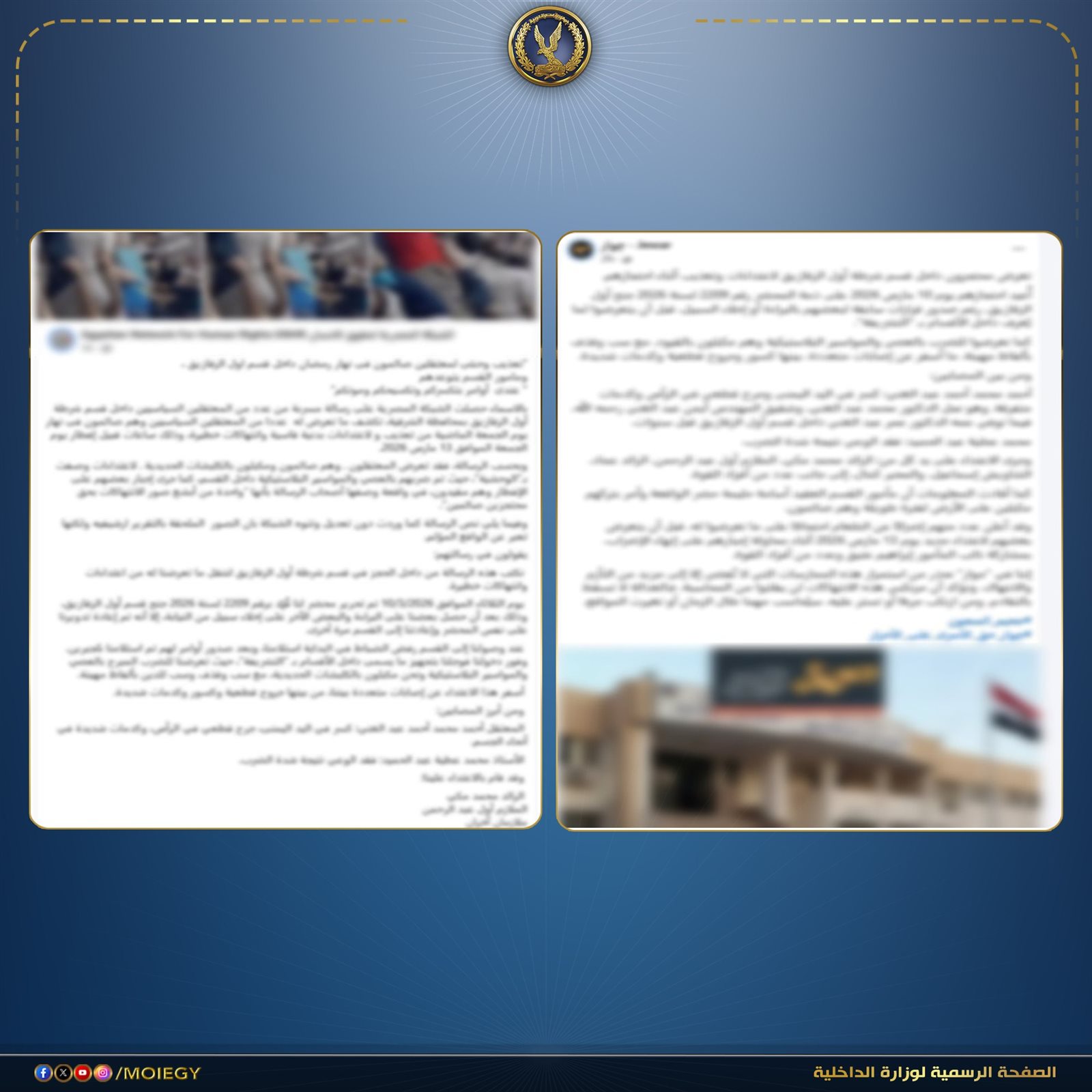 نفى مصدر أمني جملة وتفصيلا صحة ما تم تداوله عبر عدد من الصفحات التابعة لجماعة الإخوان الإرهابية على مواقع التواصل الاجتماعي، بشأن مزاعم إضراب عدد من نزلاء أحد أقسام الشرطة بمحافظة الشرقية اعتراضا على تعرضهم للتعذيب، إلى جانب نشر صور مفبركة بهدف الإيحاء بتزايد أعداد النزلاء وتردي أوضاعهم المعيشية.