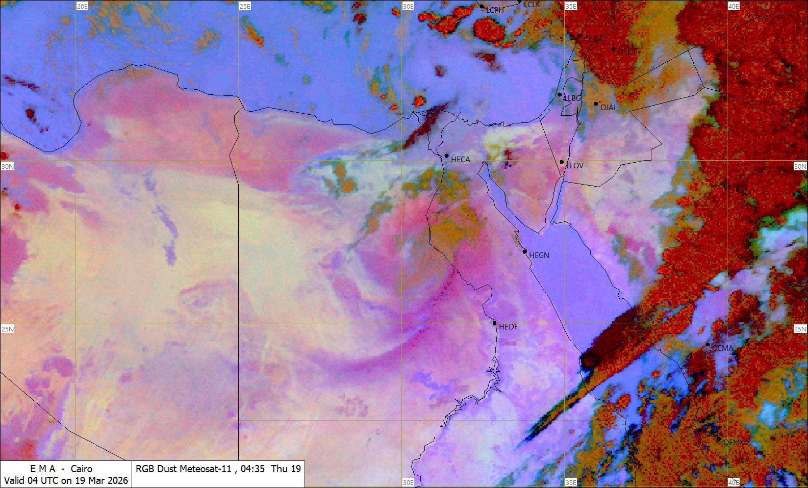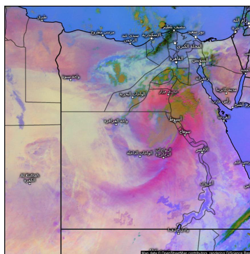 تشير آخر صور الأقمار الصناعية إلى الرمال المثارة على مناطق من الصحراء الغربية (الواحات الفرافرة، الداخلة، الخارجة، البحرية) يصاحبها تدهور في مستوى الرؤية الأفقية.