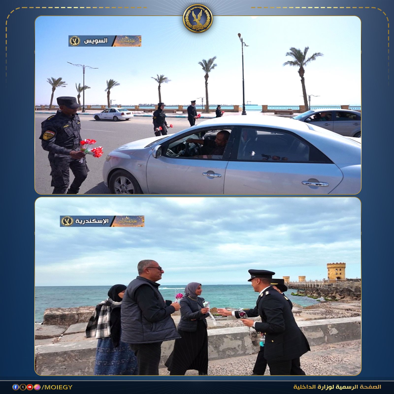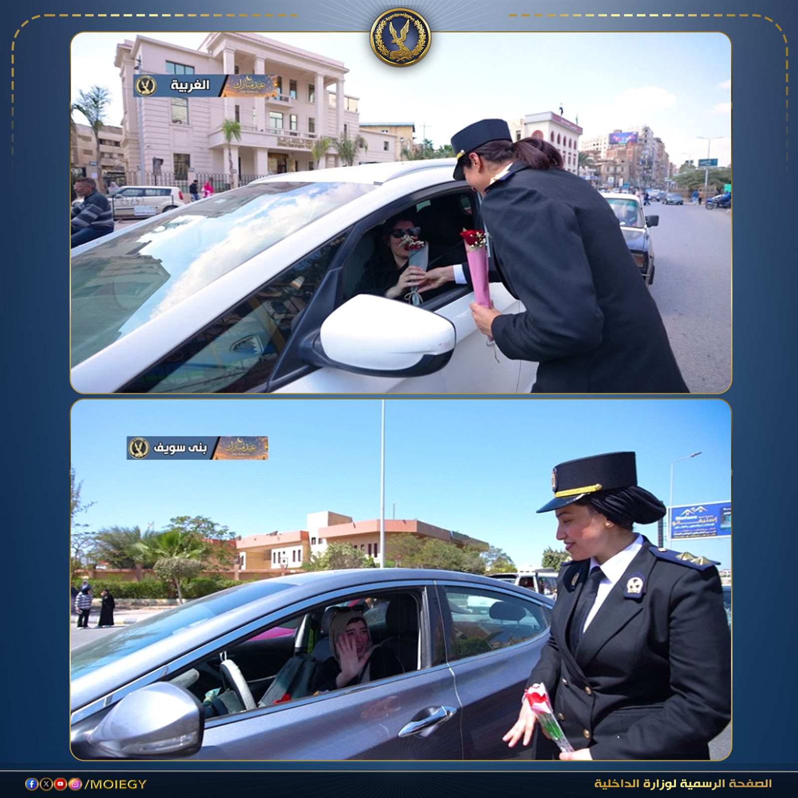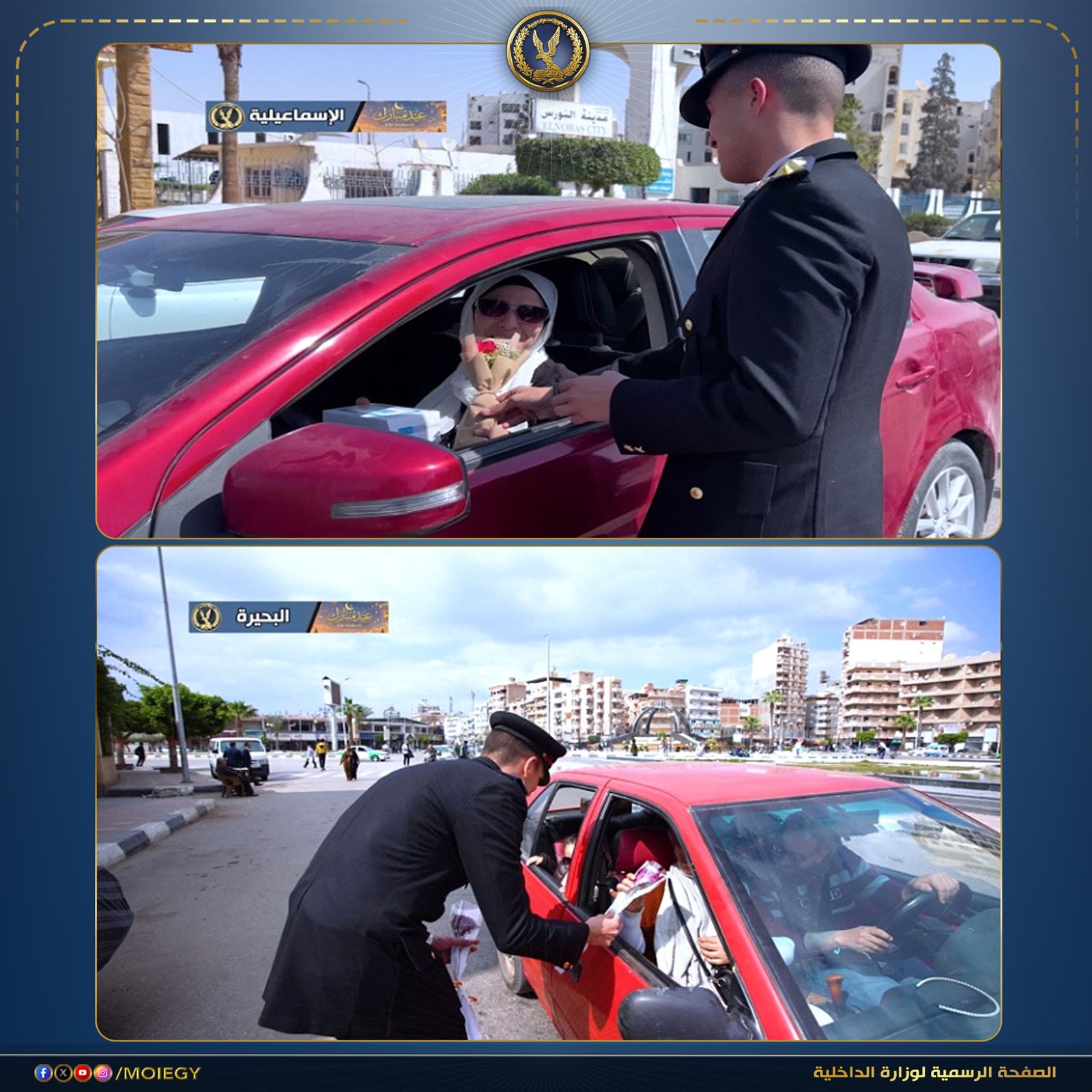 رجال الشرطة يشاركون المواطنين الاحتفال بعيد الفطر وتوزيع الورود عليهم