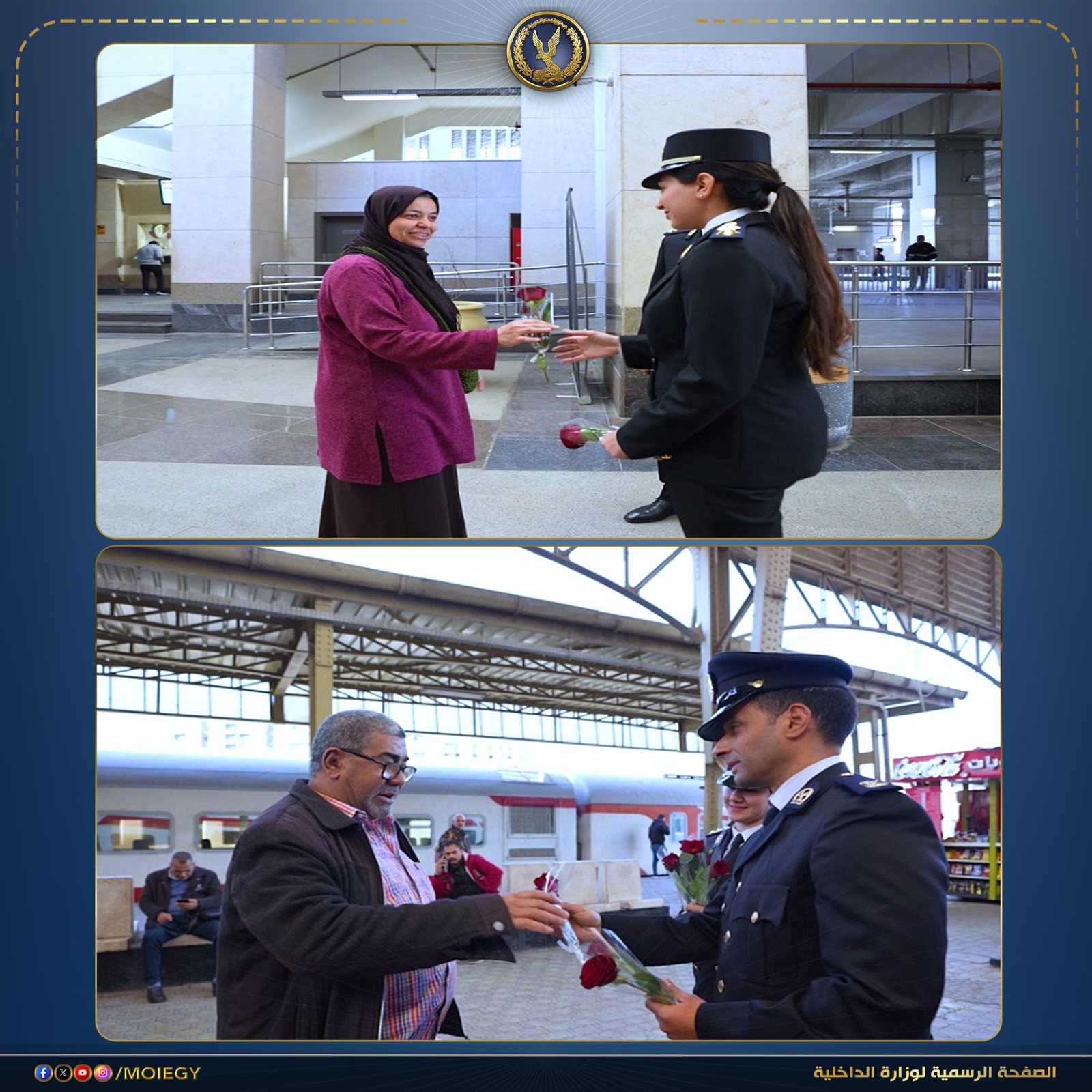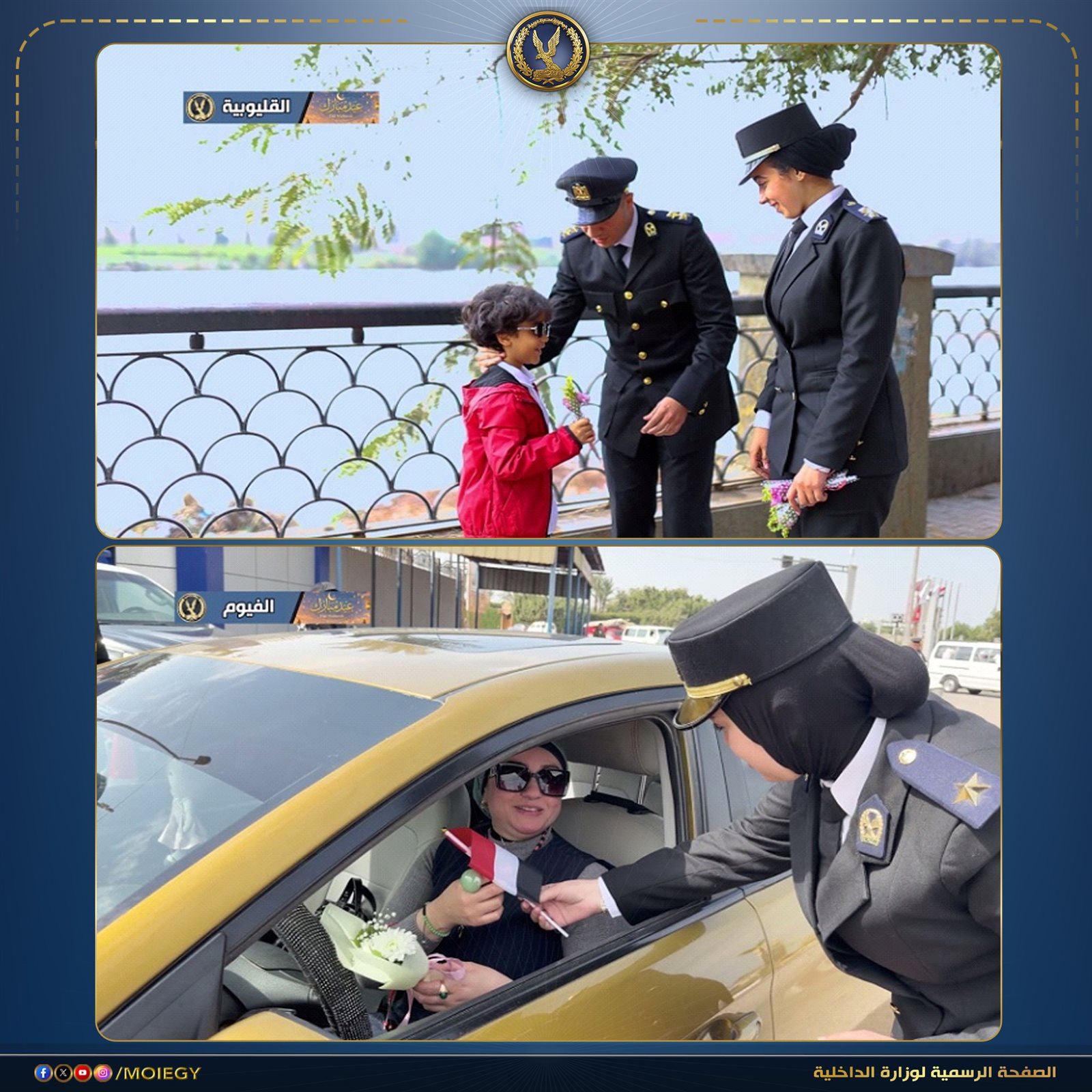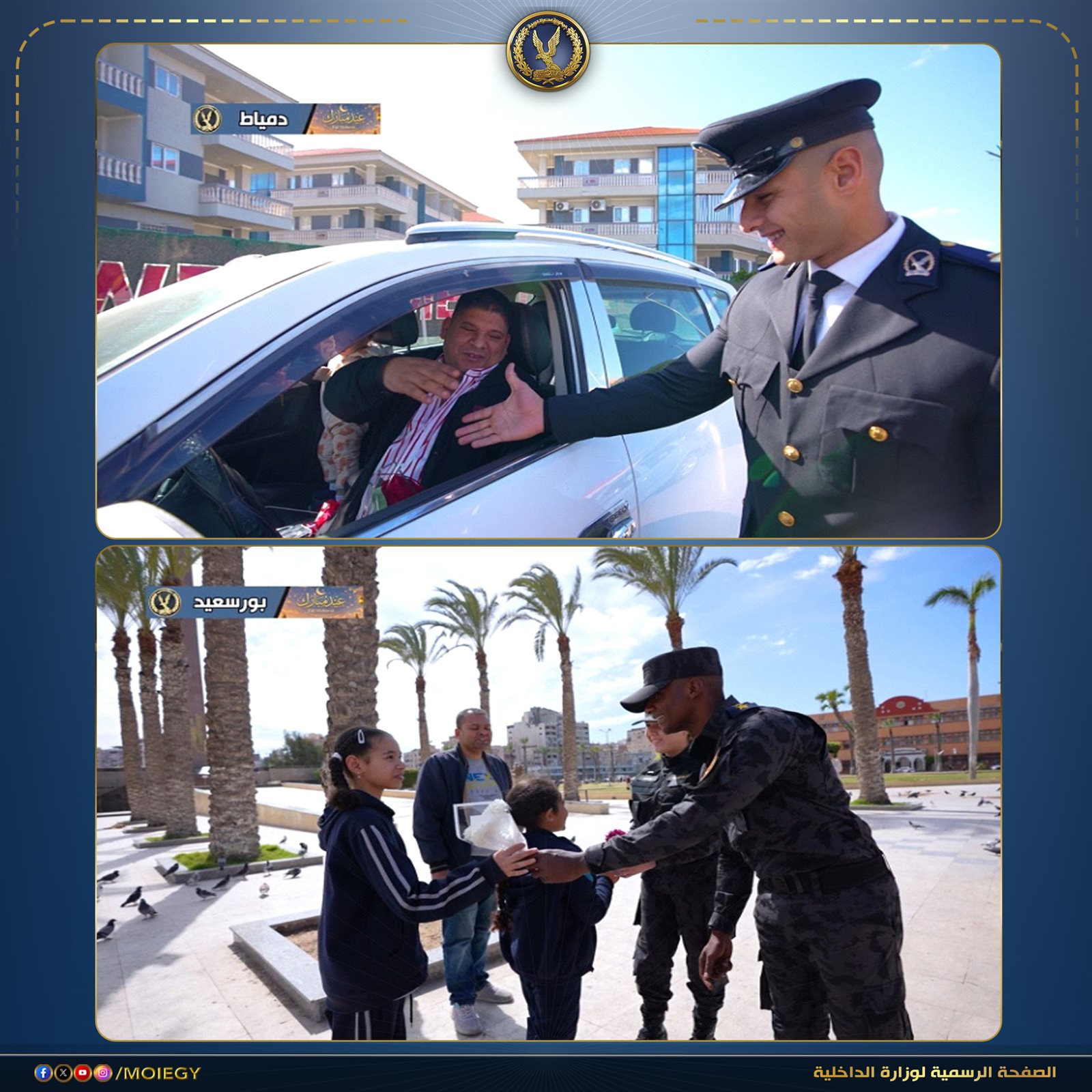 رجال الشرطة يشاركون المواطنين الاحتفال بعيد الفطر وتوزيع الورود عليهم